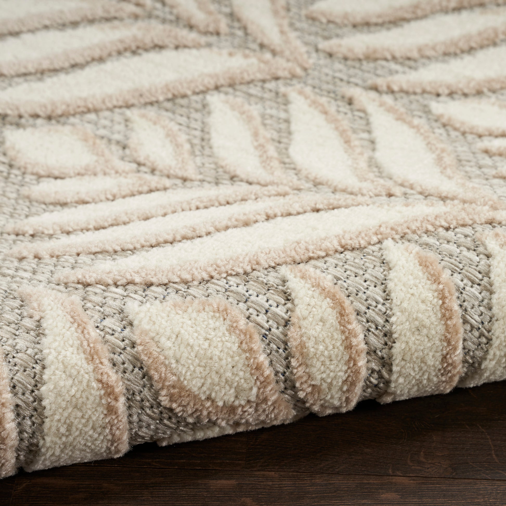 Tropical meets modern with this ivory and grey outdoor rug from the Aloha Collection. The flatwoven design is adorned with a raised, repeat palm leaf pattern that adds a subtle layer of dimension. Presented in calming colors, this botanical rug beautifully complements your patio, balcony, or deck. Made from durable polypropylene yarns that make it great for use in high-traffic indoor spaces as well, such as your kitchen, dining room, and living room. Hand washable outdoors: rinse with a hose and air dry.