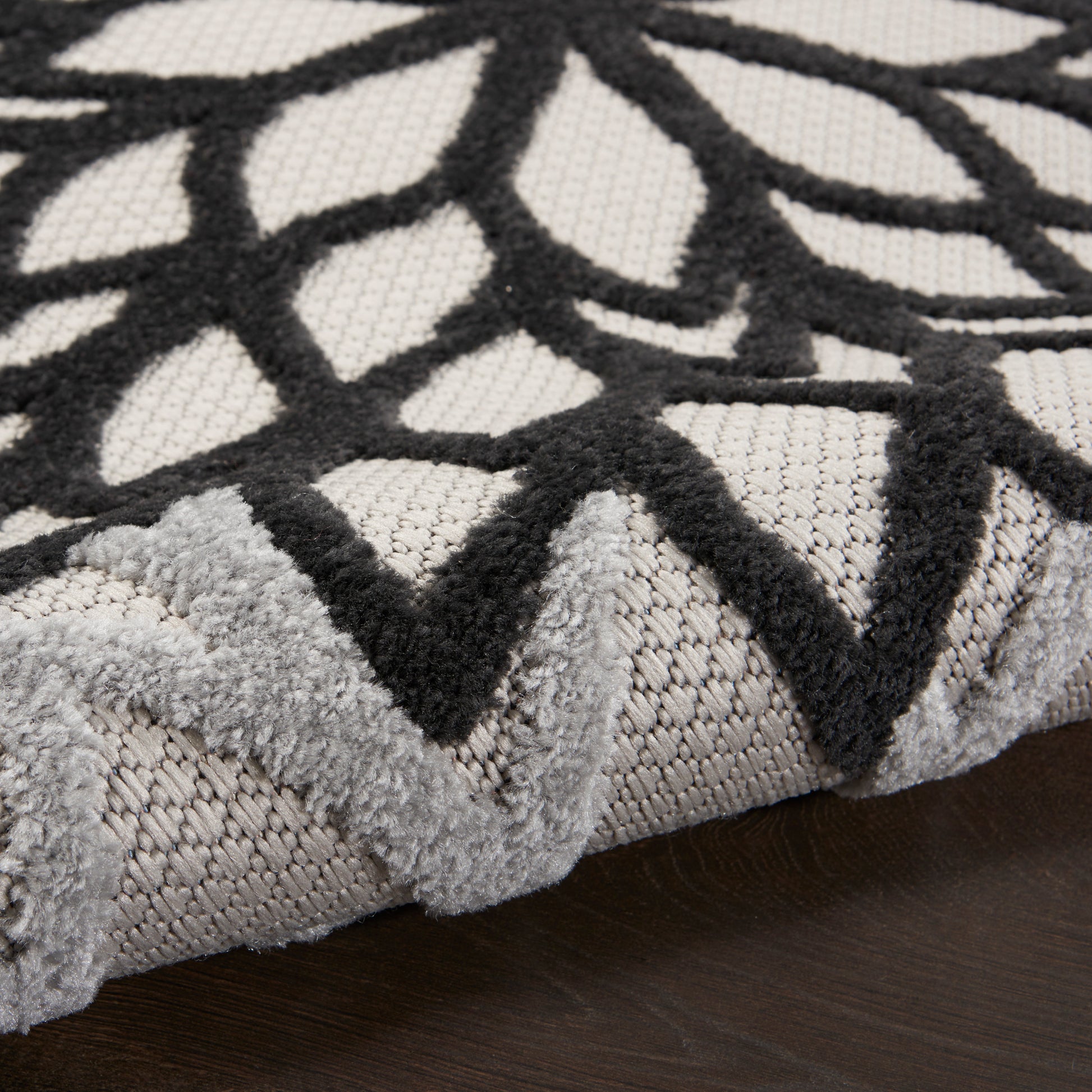 In shades of black, white and grey, this Aloha outdoor rug brings extra life and excitement to your patio, deck, or poolside. Its high-low construction combines delightful texture with an intricately woven base for an exceptional look and feel that stands up to the elements. This rug is machine-made from premium stain-resistant fibers that are easily washable with a hose: simply rinse and allow both sides time to fully air dry. To extend the life of your rug, bring indoors during extreme weather.