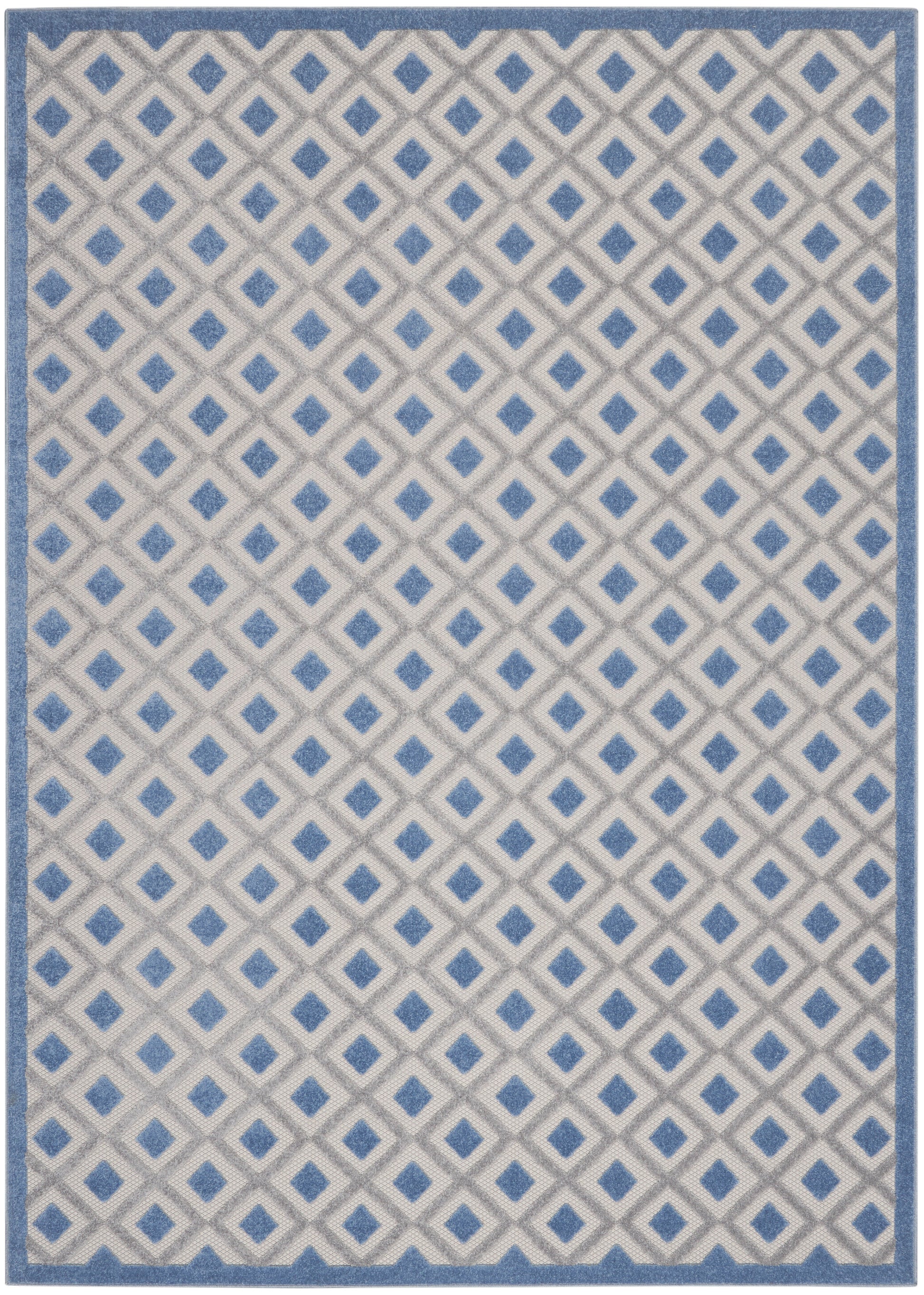 Introduce texture and pattern to your porch or deck with ease with this outdoor rug from the Aloha Collection. Simple in its sophistication, it features an all-over concentric diamond motif with a simple border in grey, blue, and ivory tones that work beautifully in modern and contemporary settings. Made from premium stain resistant fibers for durability and ease of cleaning. Hand washable outdoors: rinse with a hose and air dry.
