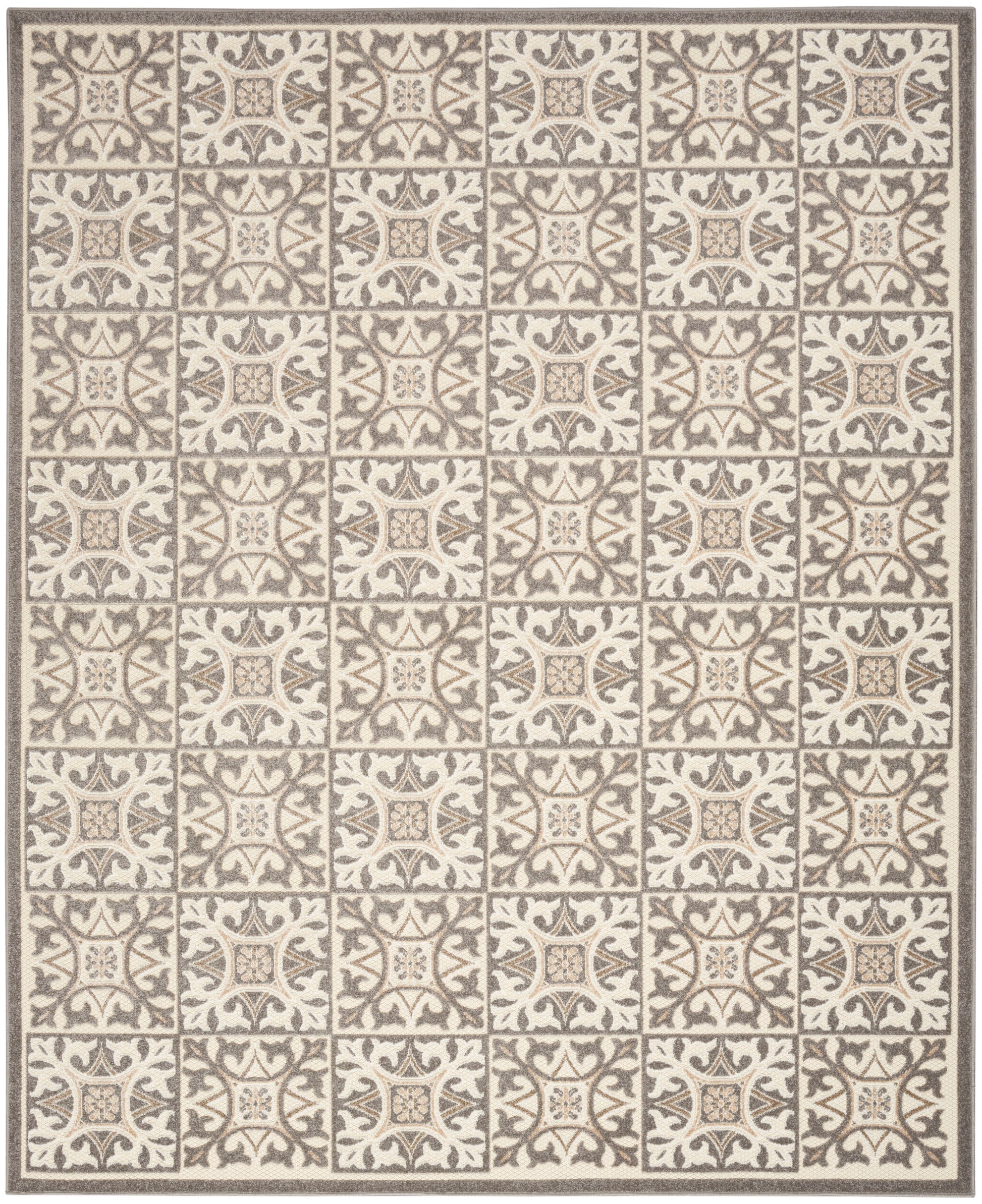 This Aloha outdoor rug brings together the best of two worlds: the classic charm of patterned tile and the warmth of an area rug! Featuring an ornate geometric pattern in ivory and grey, this contemporary rug offers a quick and easy alternative to laying down tile. Created from premium stain-resistant fibers for long wear and low maintenance – perfect for use in both indoor and outdoor spaces such as the living room, kitchen, dining room, patio, porch, or deck. Hand washable outdoors: rinse with a hose and air dry.