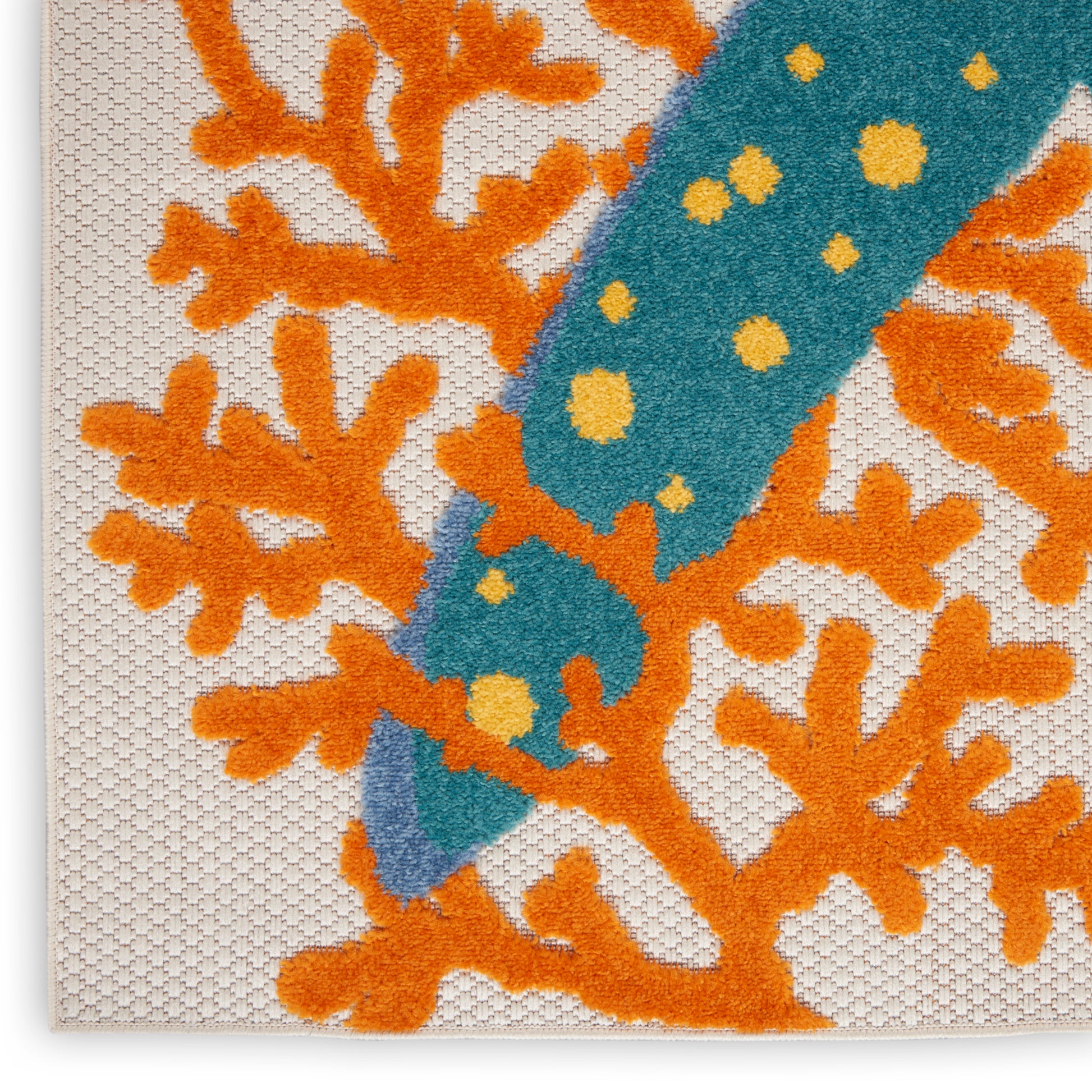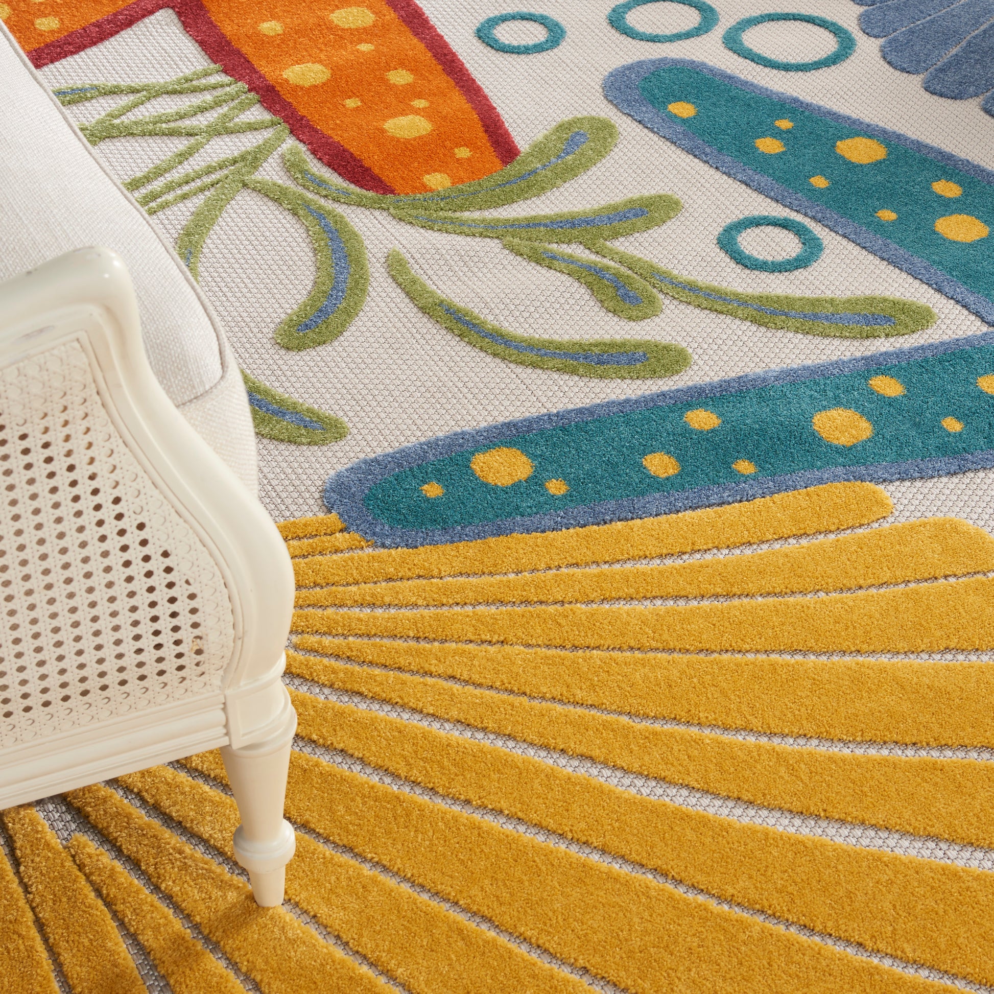 Roll out your own little slice of the beach life with this coastal outdoor area rug from the Aloha Collection. Breezy starfish, seashells, and undersea bubbles woven in vibrant multicolor sets a foundation for festive days on your patio, deck, or anywhere inside your home. Made from premium stain resistant fibers for durability and ease of cleaning. Hand washable outdoors: rinse with a hose and air dry.