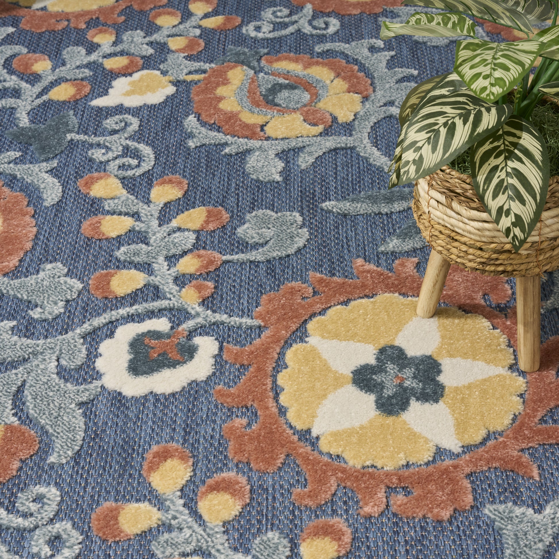 In swirling vines and flowers of rose, yellow, and blue, this Aloha outdoor rug complements your patio, porch or poolside setting. A high-low weave combines textural patterns with an intricately woven base for exceptional look that stands up to the elements. Machine-made from premium stain-resistant fibers that are easily washable with a hose: simply rinse and allow both sides time to fully air dry.