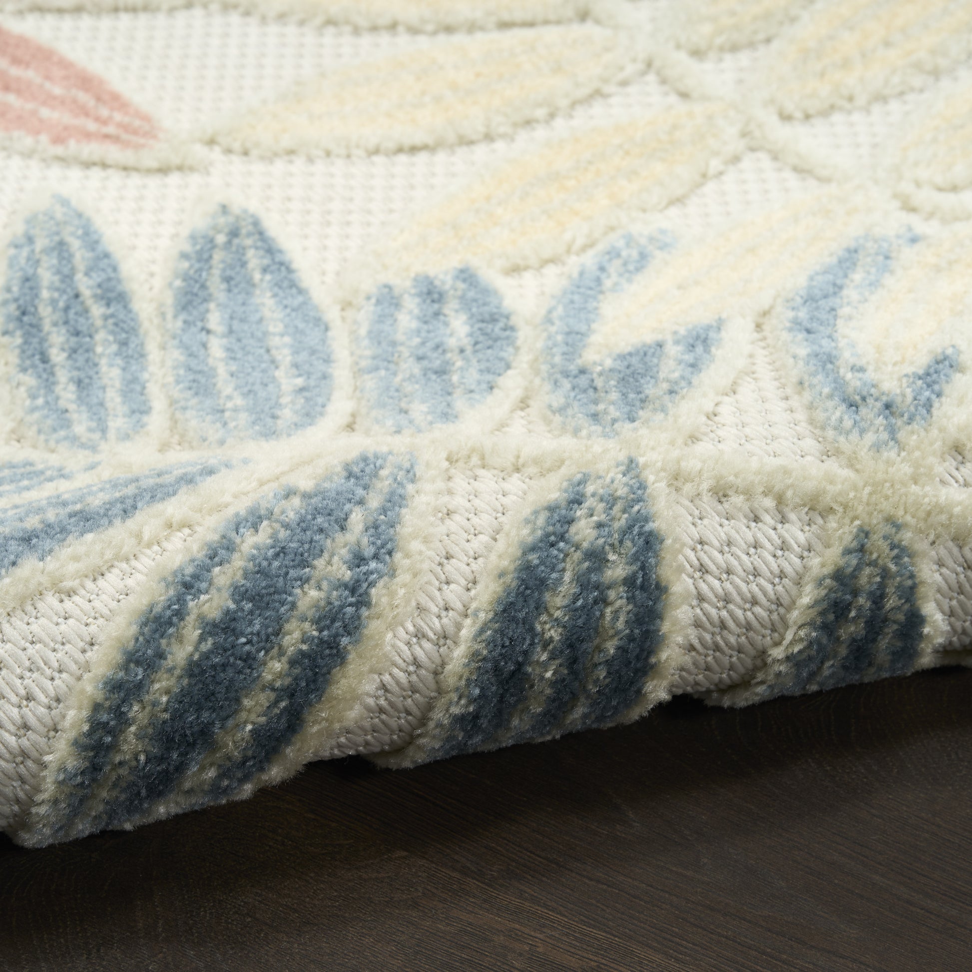 The cheerful and charming oversized leaf design of this Aloha outdoor rug is a fun way to bring tropical style to your patio, balcony, porch, deck, or yard. The high-low weave, presented in shades of ivory, rose, yellow, blue, and green, adds soft texture and a pop of dimension designed to spark conversation. Machine-made from premium stain-resistant fibers that are easily washable with a hose: simply rinse and allow both sides time to fully air dry. To extend the life of your rug, bring indoors during extreme weather.