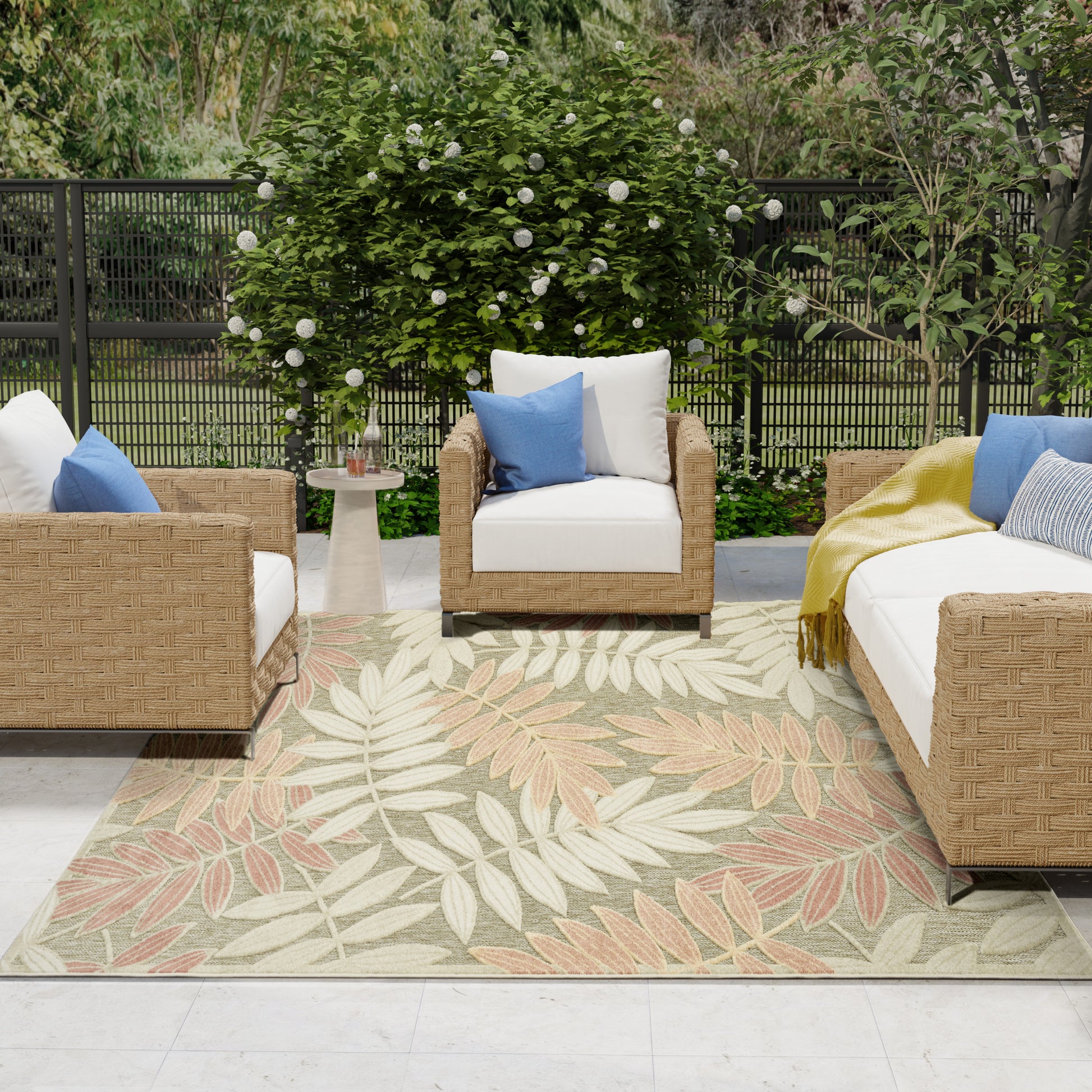 The cheerful and charming oversized leaf design of this Aloha outdoor rug is a fun way to bring tropical style to your patio, balcony, porch, deck, or yard. The high-low weave, presented in shades of ivory, rose, and sage, adds soft texture and a pop of dimension designed to spark conversation. Machine-made from premium stain-resistant fibers that are easily washable with a hose: simply rinse and allow both sides time to fully air dry. To extend the life of your rug, bring indoors during extreme weather.