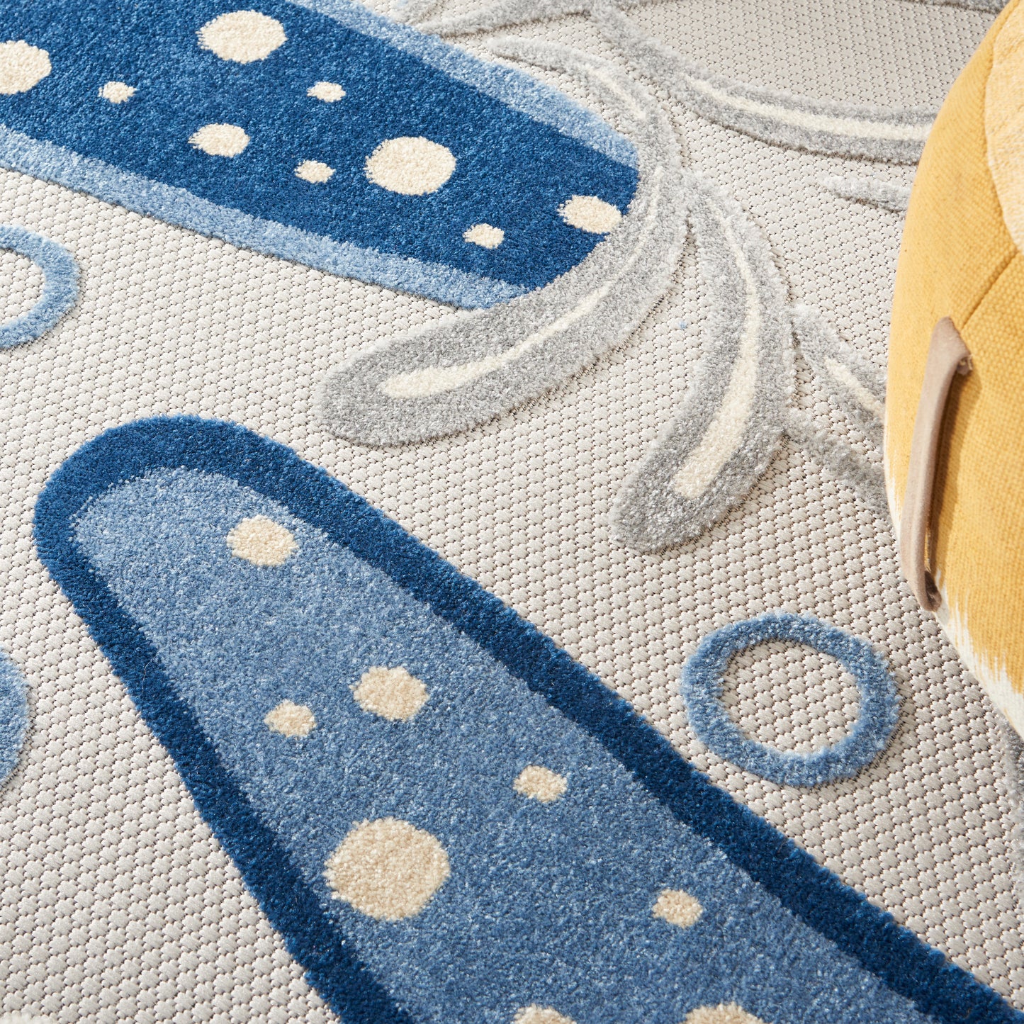 Roll out your own little slice of the beach life with this coastal outdoor area rug from the Aloha Collection. Breezy starfish, seashells, and undersea bubbles woven in cool grey, blue, white, and ivory tones set a foundation for relaxation on your patio, deck, or anywhere inside your home. Made from premium stain resistant fibers for durability and ease of cleaning. Hand washable outdoors: rinse with a hose and air dry.