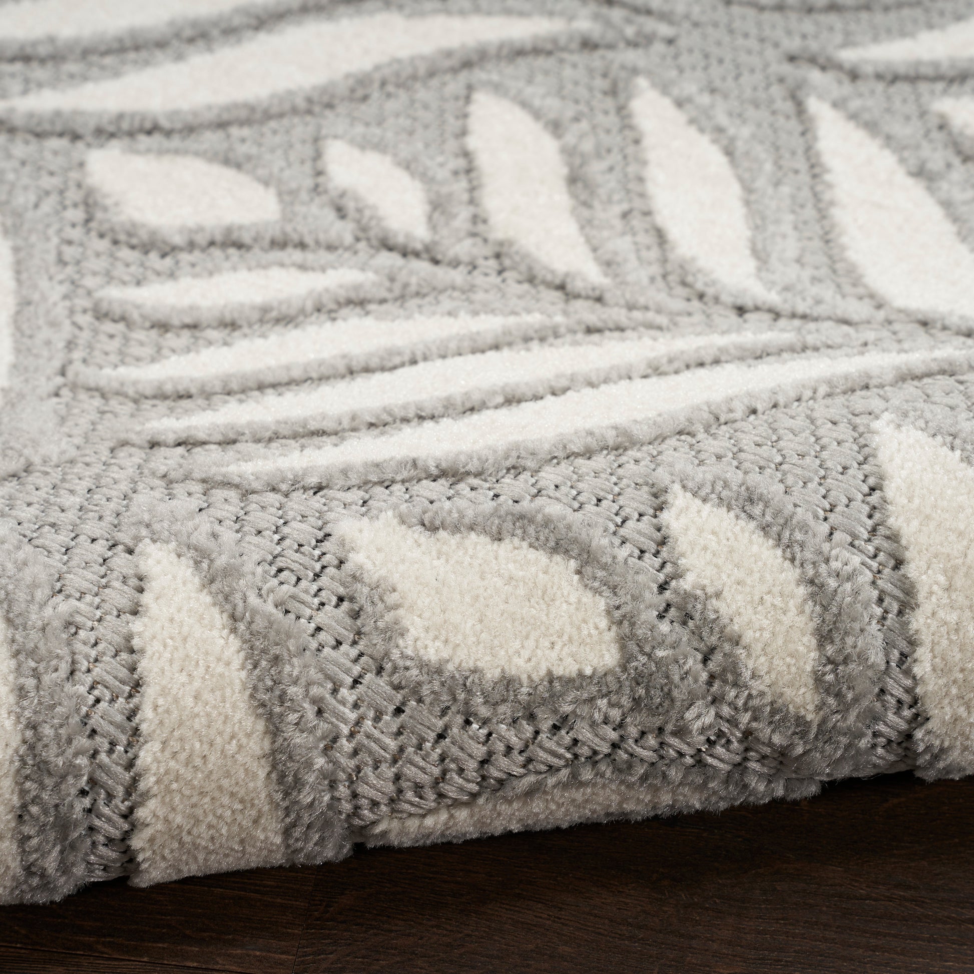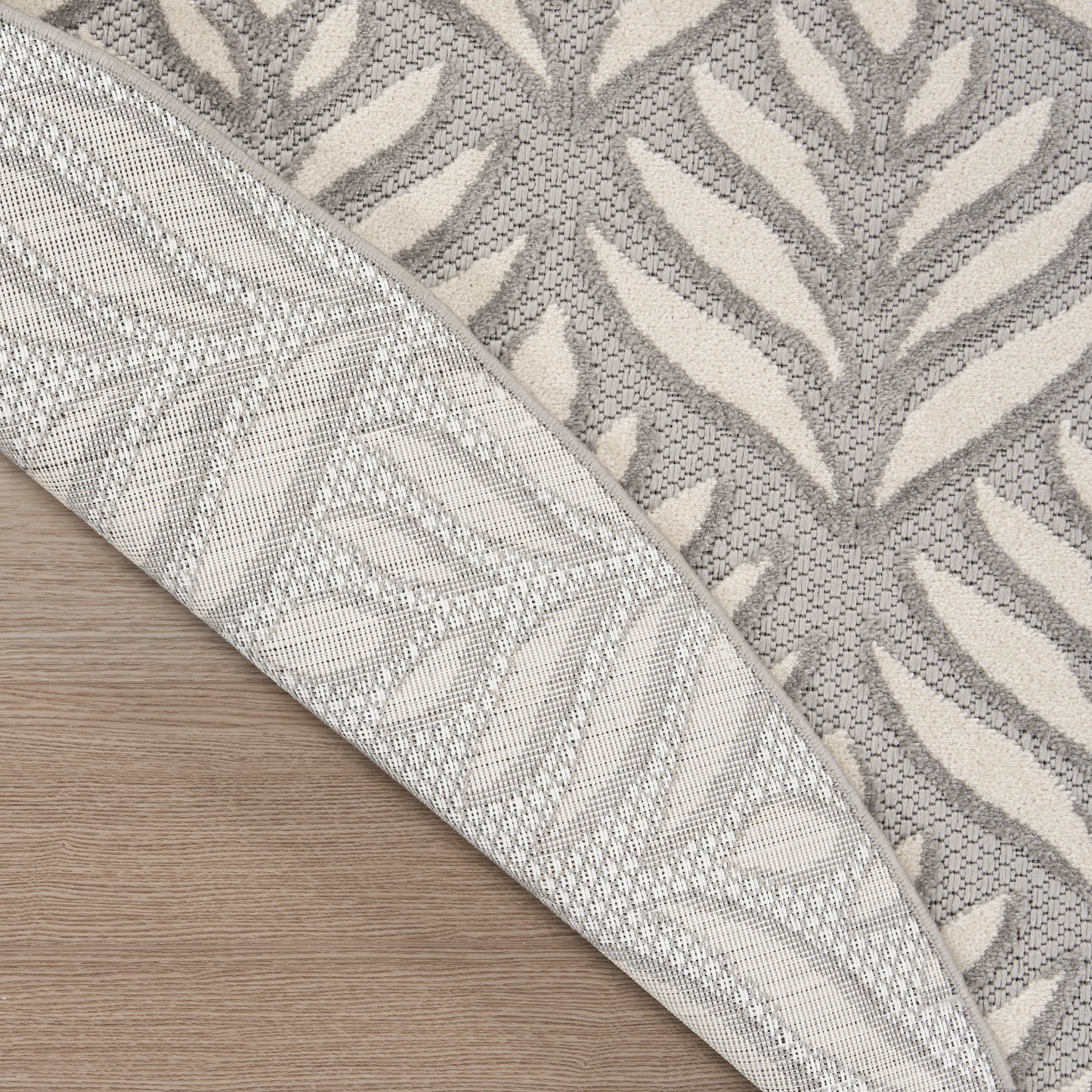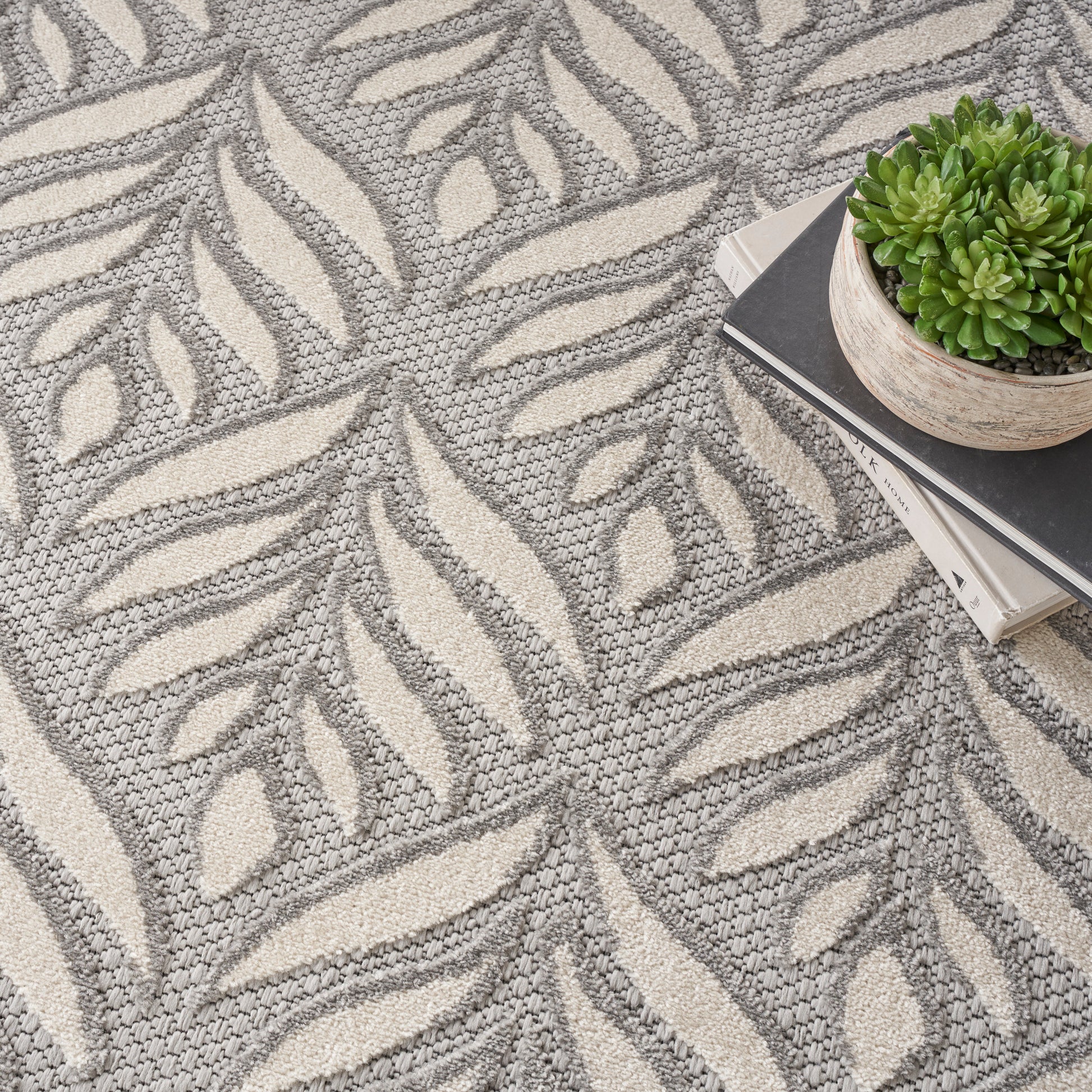Tropical meets modern with this grey outdoor rug from the Aloha Collection. The flatwoven design is adorned with a raised, repeat palm leaf pattern that adds a subtle layer of dimension. Presented in calming colors, this botanical rug beautifully complements your patio, balcony, or deck. Made from durable polypropylene yarns that make it great for use in high-traffic indoor spaces as well, such as your kitchen, dining room, and living room. Hand washable outdoors: rinse with a hose and air dry.