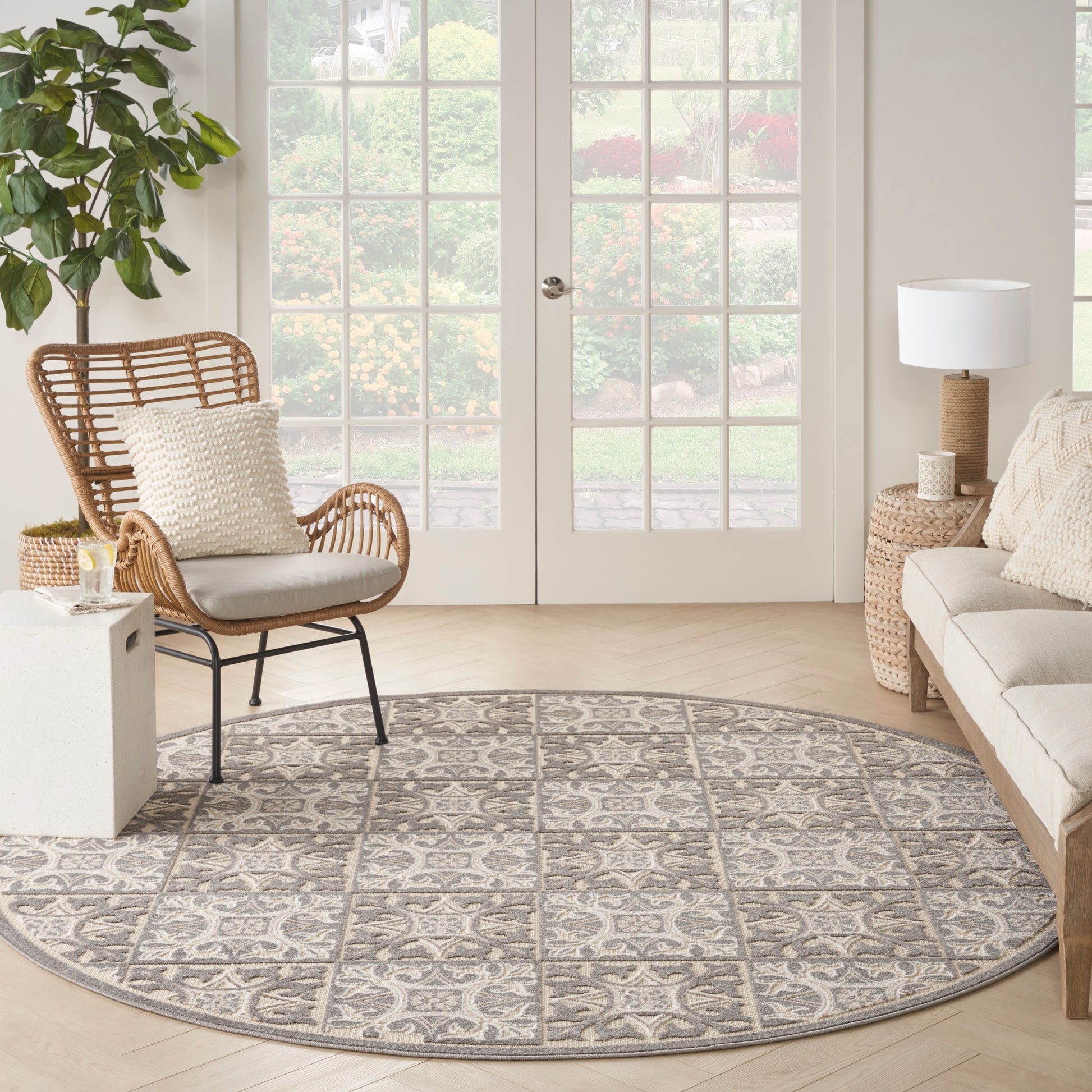 This Aloha outdoor rug brings together the best of two worlds: the classic charm of patterned tile and the warmth of an area rug! Featuring an ornate geometric pattern in ivory and grey, this contemporary rug offers a quick and easy alternative to laying down tile. Created from premium stain-resistant fibers for long wear and low maintenance – perfect for use in both indoor and outdoor spaces such as the living room, kitchen, dining room, patio, porch, or deck. Hand washable outdoors: rinse with a hose and air dry.