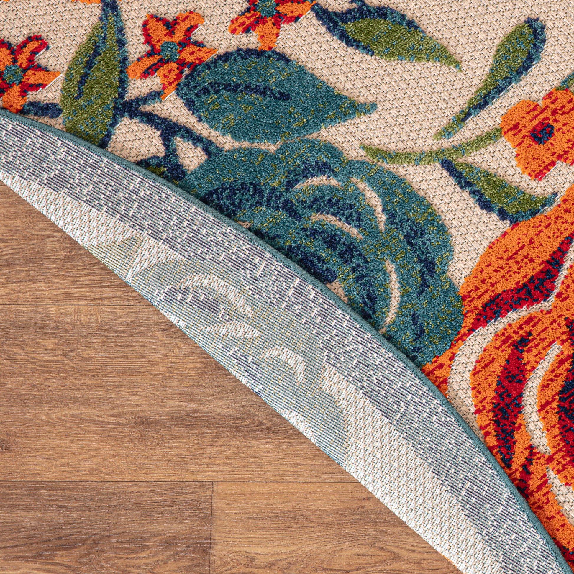 Spring is in full bloom year-round when you place this outdoor rug on your patio, porch, or indoor spaces! The oversized orange, blue, red, and green floral pattern is enhanced with a subtly raised cut pile that adds a touch of texture and dimension. Whether your taste is in neutrals or more colorful rugs, this bold design is sure to be a conversation starter. Made from premium stain resistant fibers for durability and ease of cleaning. Hand washable outdoors: rinse with a hose and air dry.