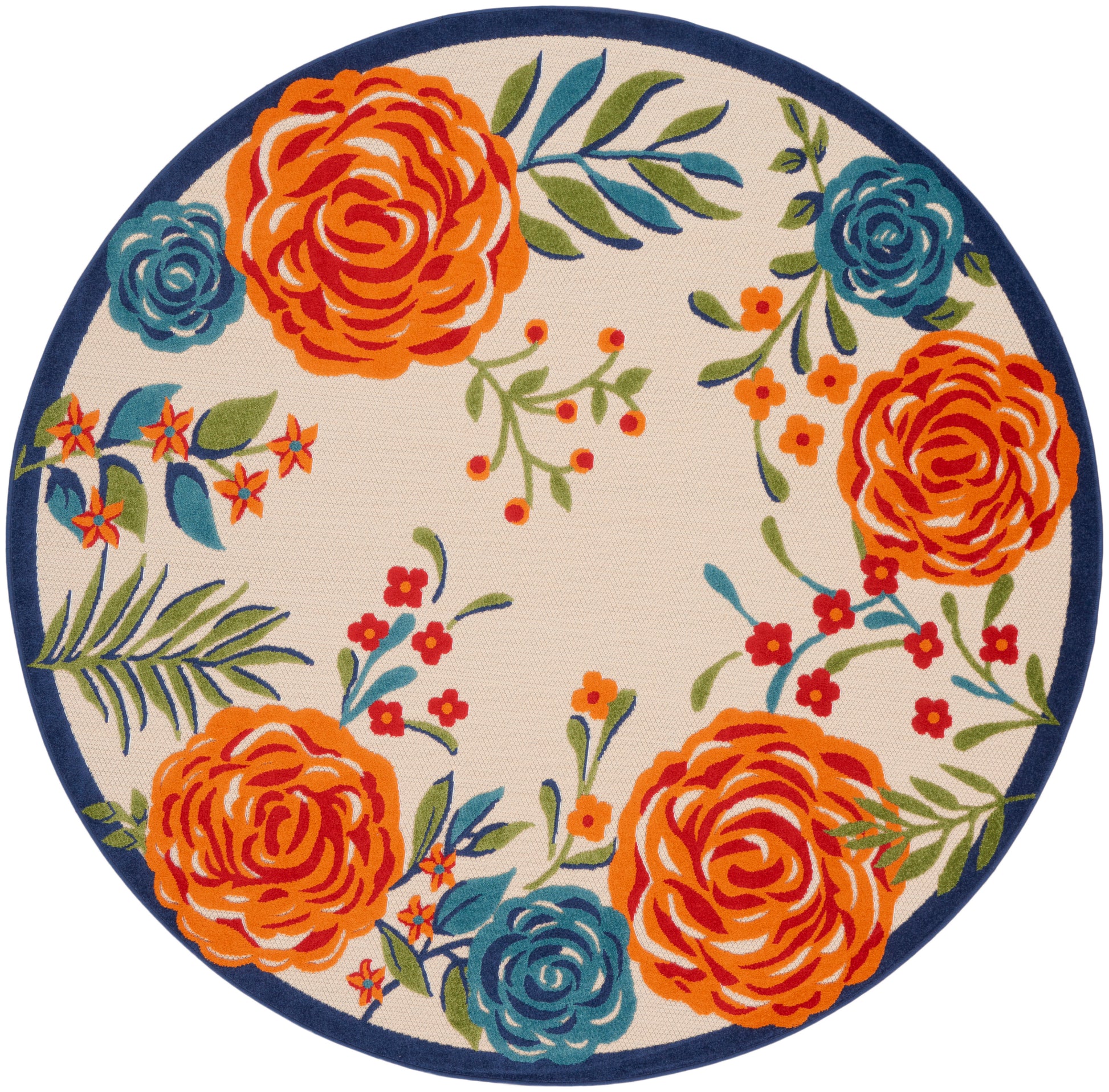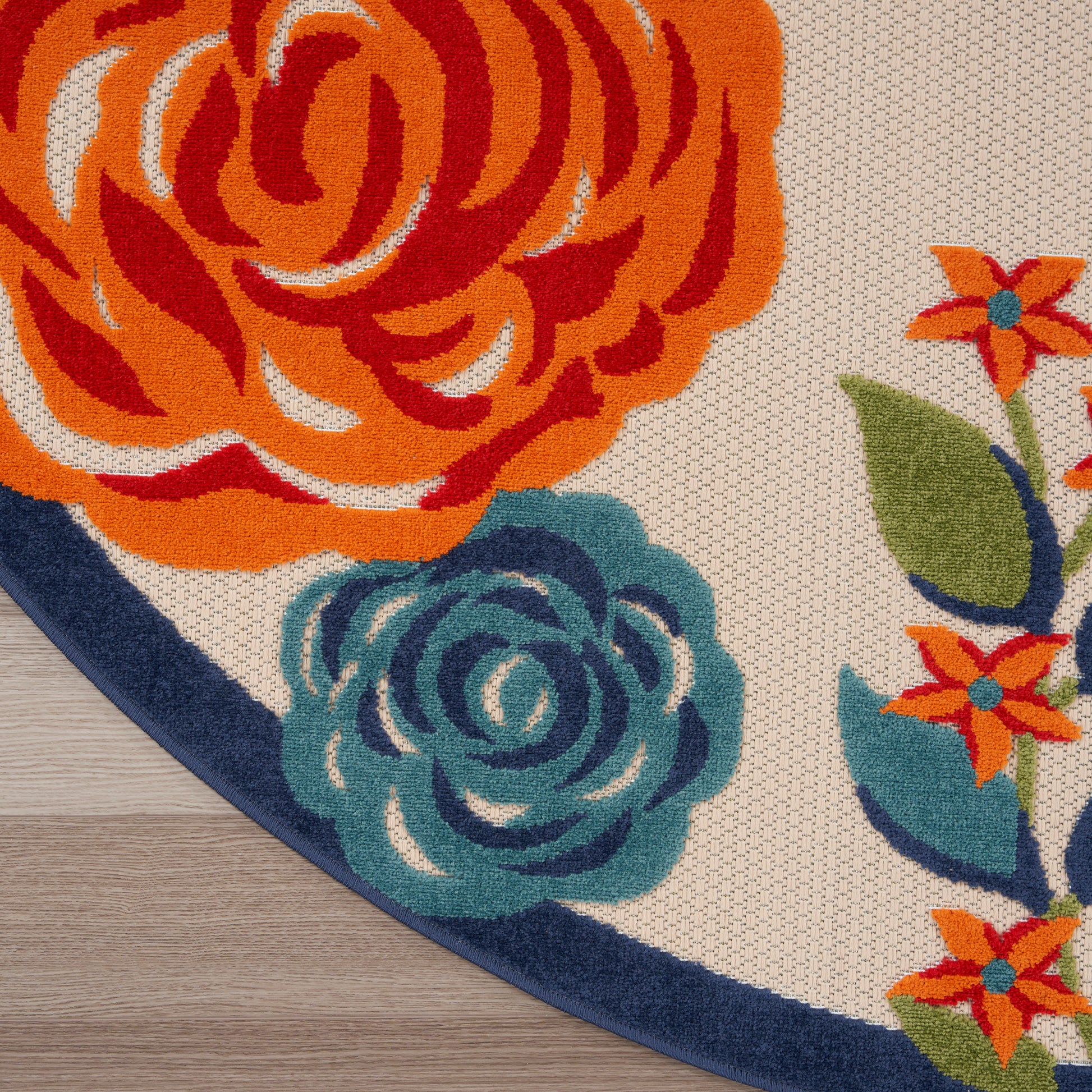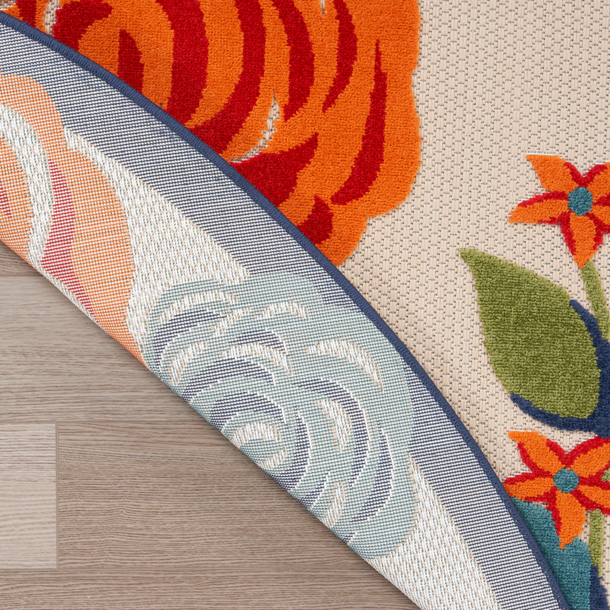 Spring is in full bloom year-round when you place this outdoor rug on your patio, porch, or indoor spaces! The oversized multicolored floral pattern is enhanced with a subtly raised cut pile that adds a touch of texture and dimension. Whether your taste is in neutrals or more colorful rugs, this bold design is sure to be a conversation starter. Made from premium stain resistant fibers for durability and ease of cleaning. Hand washable outdoors: rinse with a hose and air dry.