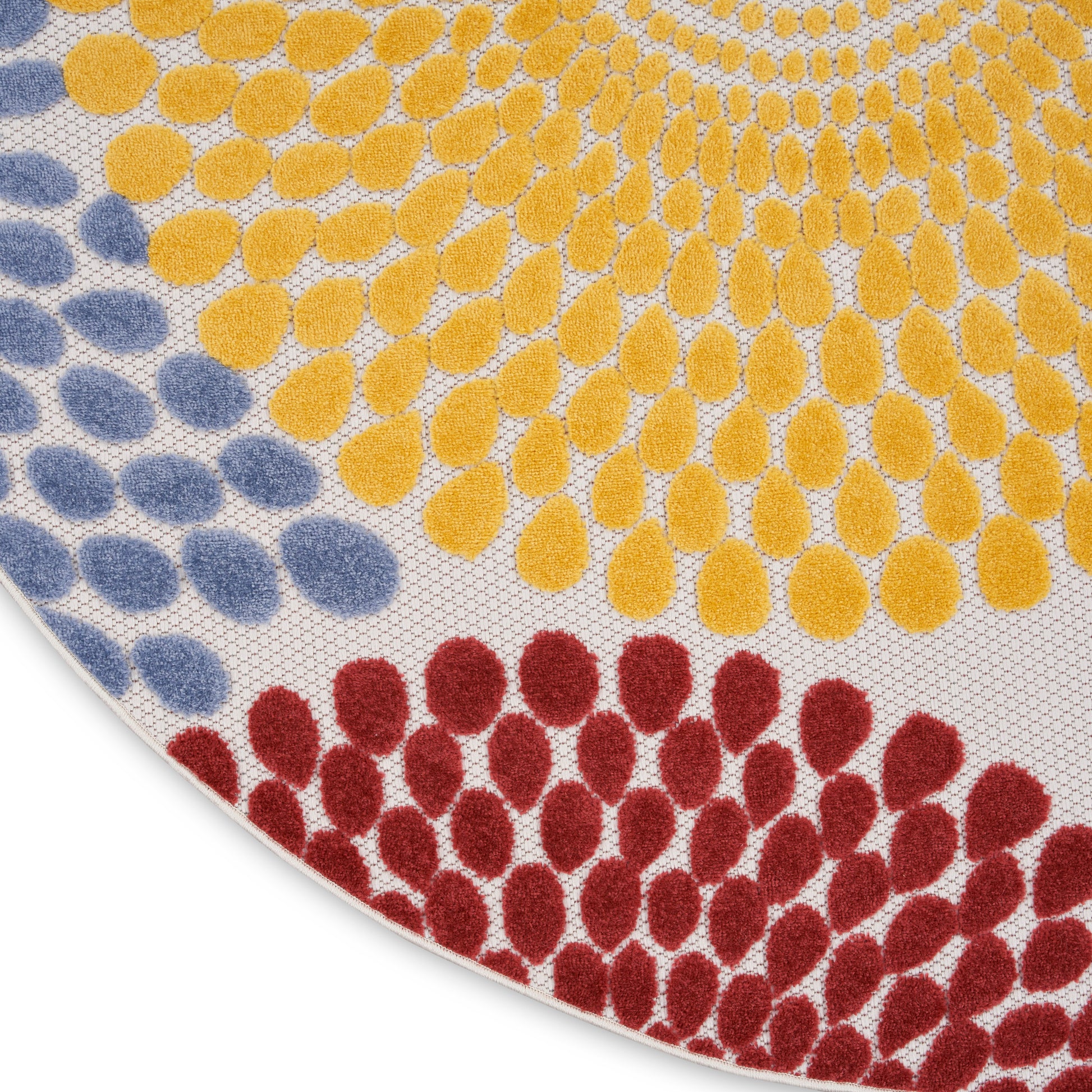Liven up your space with the bold geometric design of this outdoor rug from the Aloha Collection. Presented in vibrant blue, red, yellow, green, and orange, the overlapping circular tear drop pattern is enhanced by a soft, raised texture that stands out against its flatwoven ground. With a versatile, easy to clean construction, this colorful rug beautifully complements your indoor and outdoor spaces including the living room, dining room, hallway, deck, and patio. Hand washable outdoors: rinse with a hose and air dry.