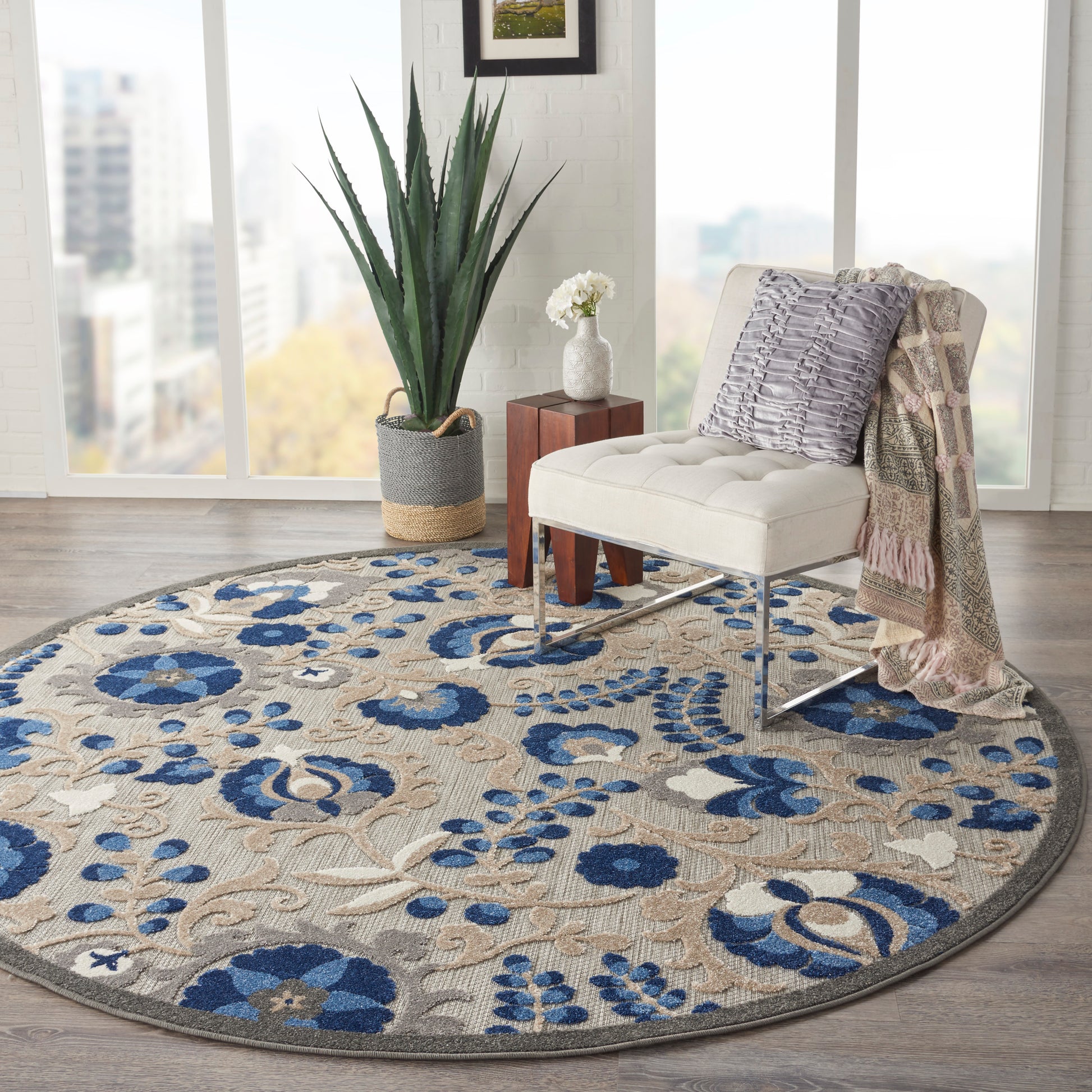 In swirling vines and flowers of blue, cream and grey, this Aloha outdoor rug complements your patio, porch or poolside setting. A high-low weave combines textural patterns with an intricately woven base for exceptional look that stands up to the elements. Machine-made from premium stain-resistant fibers that are easily washable with a hose: simply rinse and allow both sides time to fully air dry.