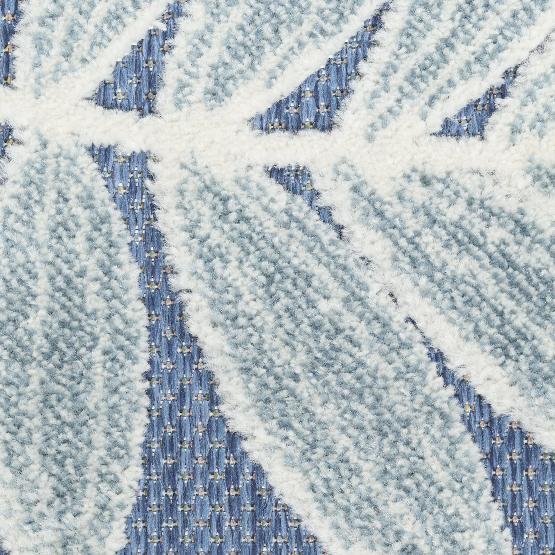 The cheerful and charming oversized leaf design of this Aloha outdoor rug is a fun way to bring tropical style to your patio, balcony, porch, deck, or yard. The high-low weave, presented in shades of blue and ivory, adds soft texture and a pop of dimension designed to spark conversation. Machine-made from premium stain-resistant fibers that are easily washable with a hose: simply rinse and allow both sides time to fully air dry. To extend the life of your rug, bring indoors during extreme weather.