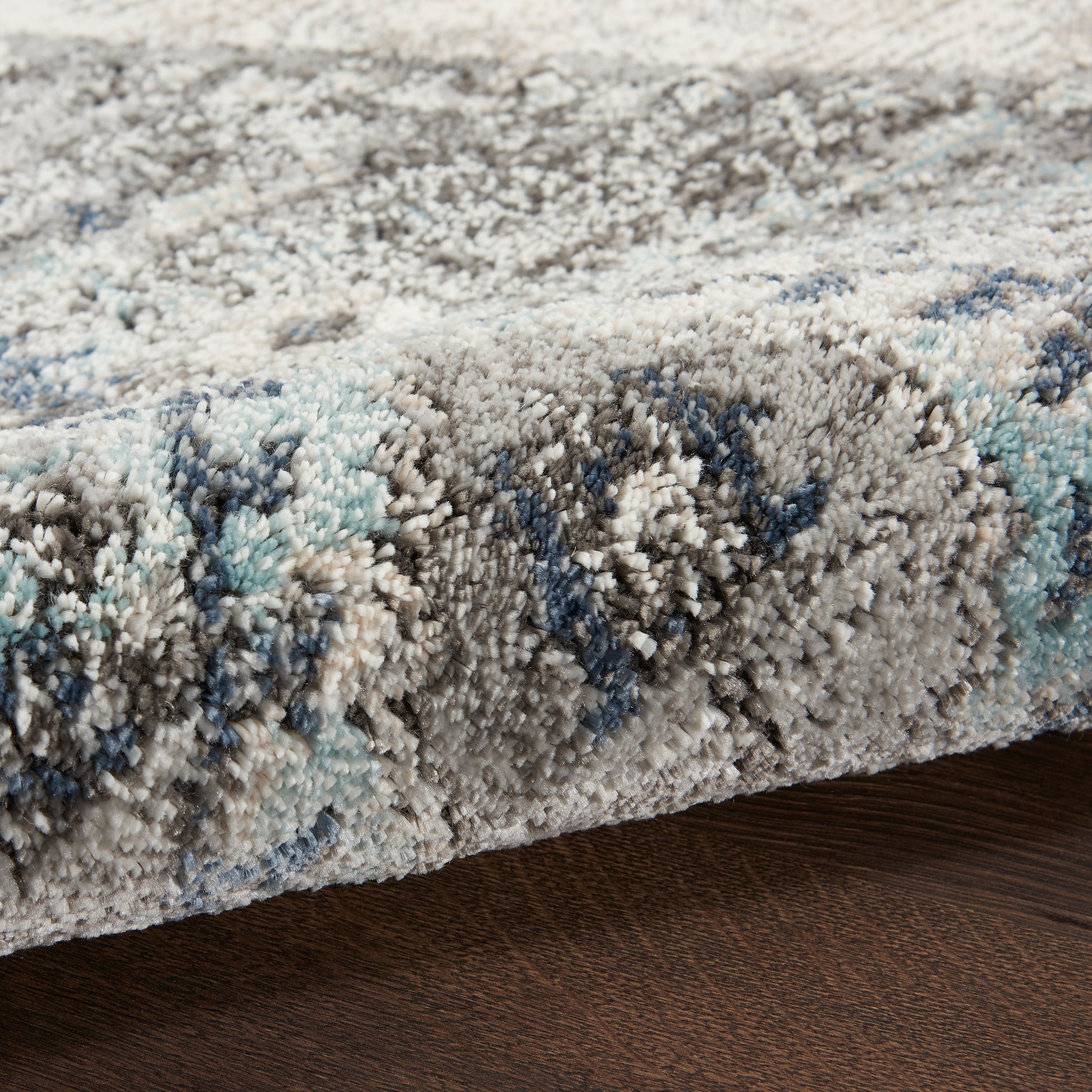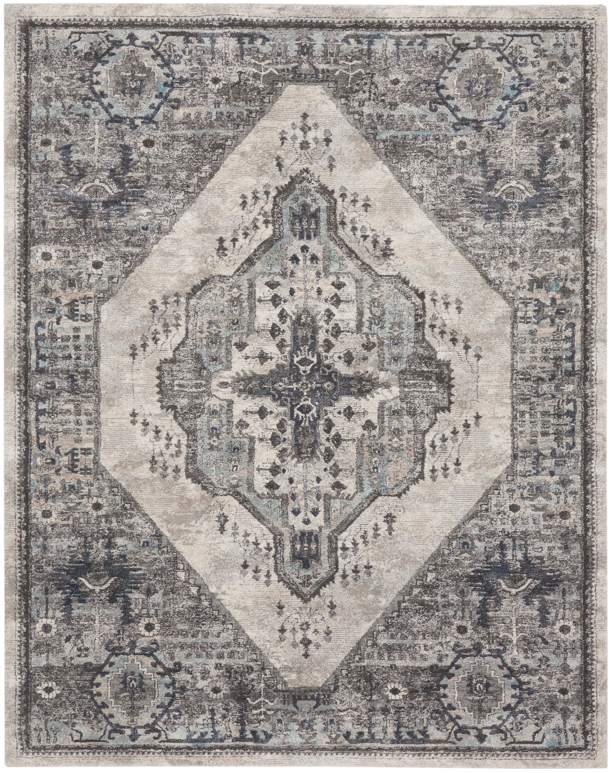 Celebrate the beauty of Persian artistry with this traditional rug by Nourison Home American Manor Collection. A breathtaking statement piece for your living room, bedroom, or home office, its muted grey pile displays a classic center medallion pattern in shades of blue, grey, and ivory. American Manor is masterfully power-loomed from a silky soft blend of polyester and polypropylene.