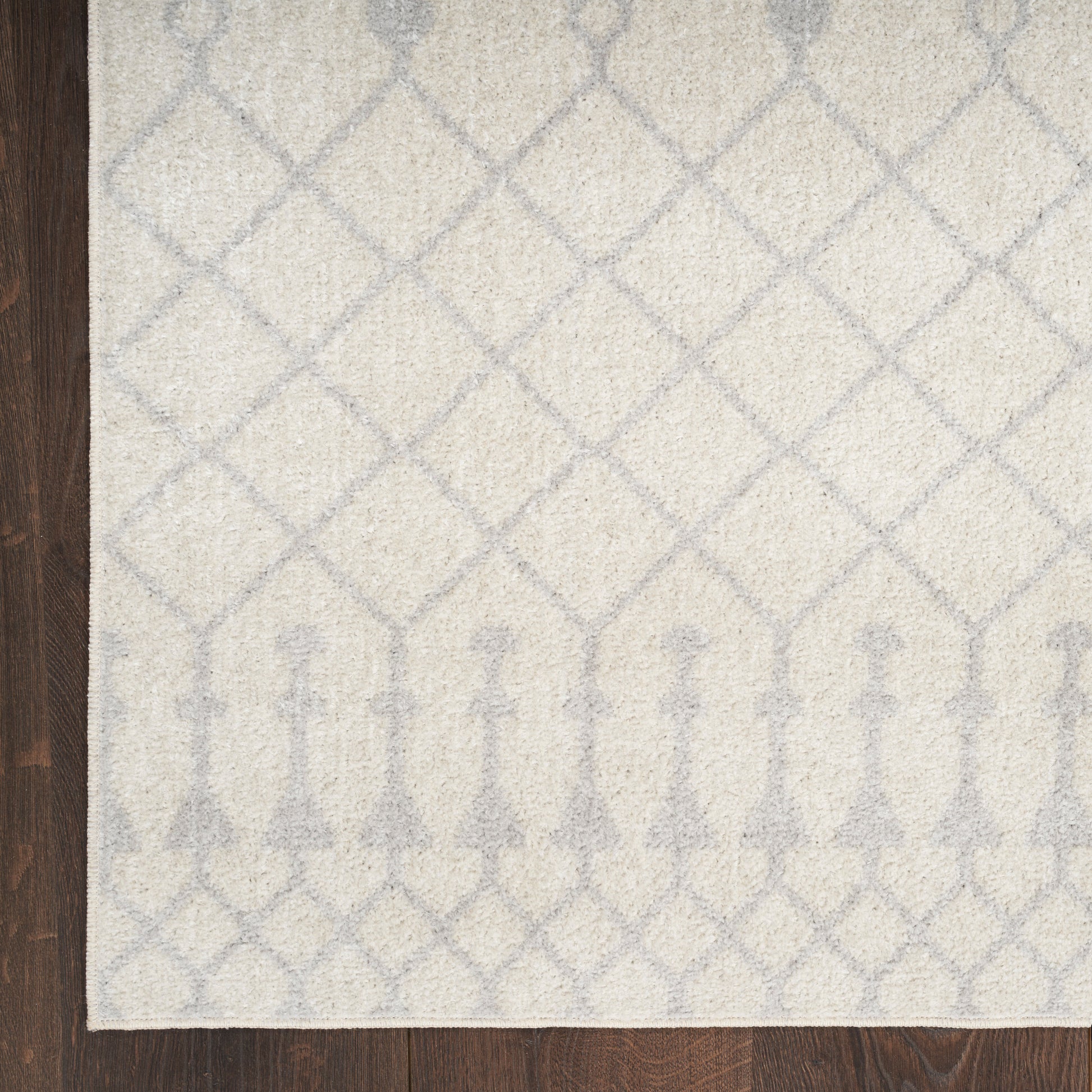 Bring global style home with this boho chic rug from the Astra Machine Washable Collection. Presented in ivory and grey, the classic Moroccan trellis pattern is finished with a vibrant sheen that shifts in tone under different light. This machine-washable rug beautifully complements modern and farmhouse décor.