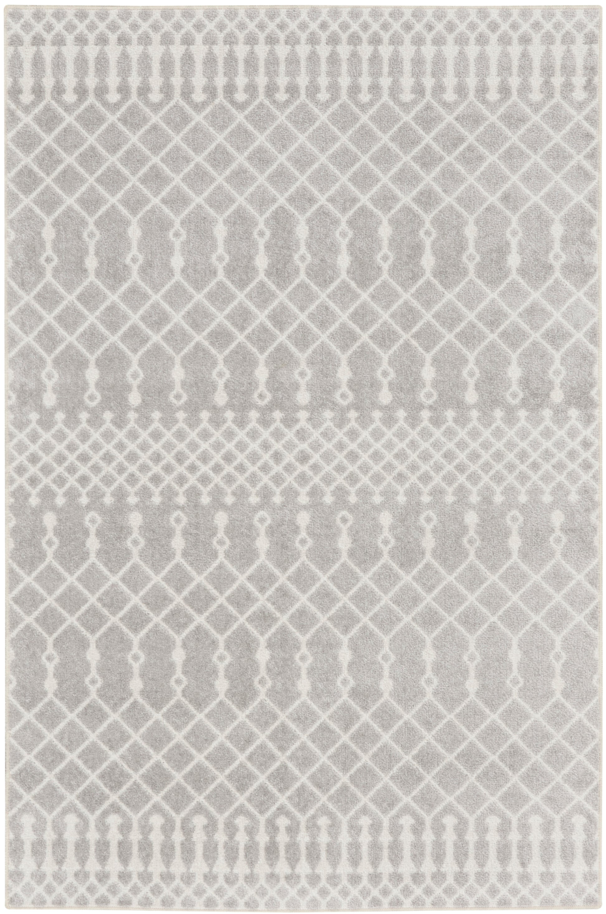 Bring global style home with this boho chic rug from the Astra Machine Washable Collection. Presented in grey and ivory, the classic Moroccan trellis pattern is finished with a vibrant sheen that shifts in tone under different light. This machine-washable rug beautifully complements modern and farmhouse décor.