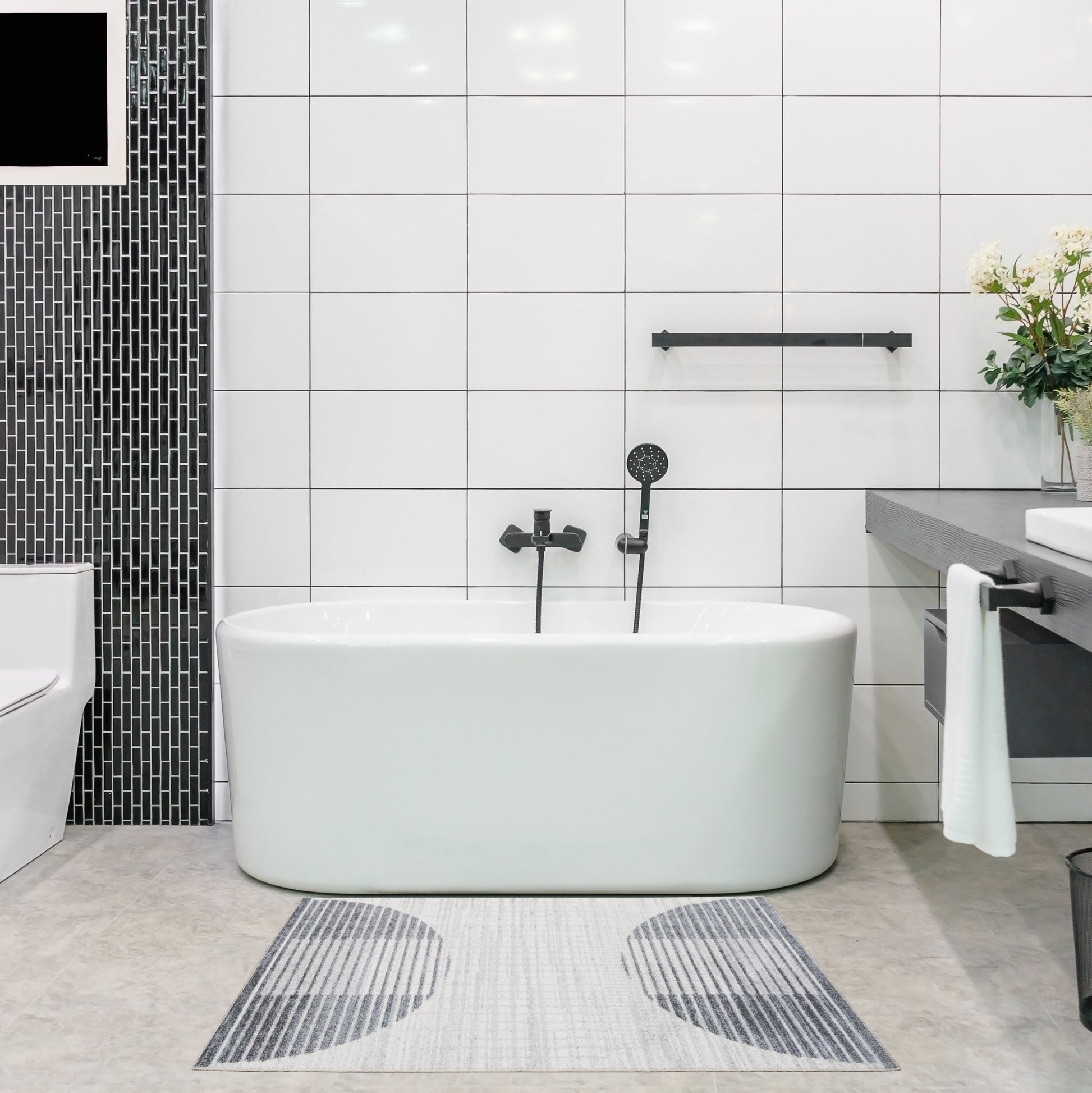 Bring balance to your living room, bedroom, or dining room with this mid-century modern rug from the Astra Machine Washable Collection. Two semi-circles are overlapped by a lined circle silhouette in grey and blue, with a shimmery finish that shifts in different lighting. This contemporary rug has a low-pile for easy placement under furniture and near doorways and is machine-washable for fuss-free cleaning.
