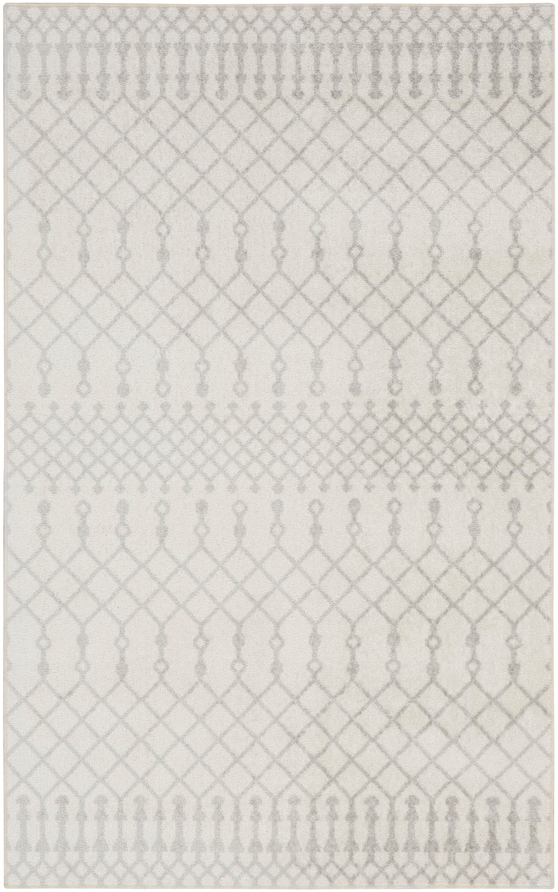 Bring global style home with this boho chic rug from the Astra Machine Washable Collection. Presented in ivory and grey, the classic Moroccan trellis pattern is finished with a vibrant sheen that shifts in tone under different light. This machine-washable rug beautifully complements modern and farmhouse décor.