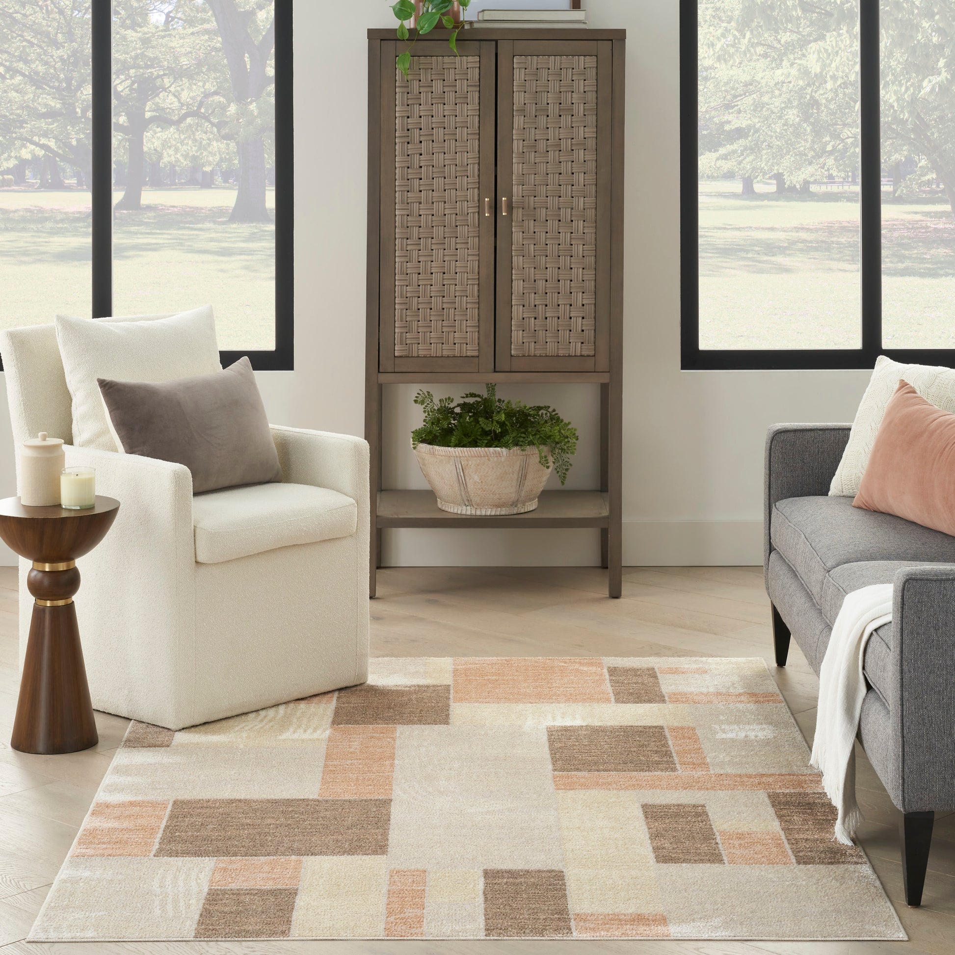 Make a bold statement with this contemporary beige rug from the Astra Machine Washable Collection. The softly textured surface features a muted color block pattern with a shimmery finish that shifts in tone under different light. Made from easy-clean yarns: simply place into your washing machine and air dry!