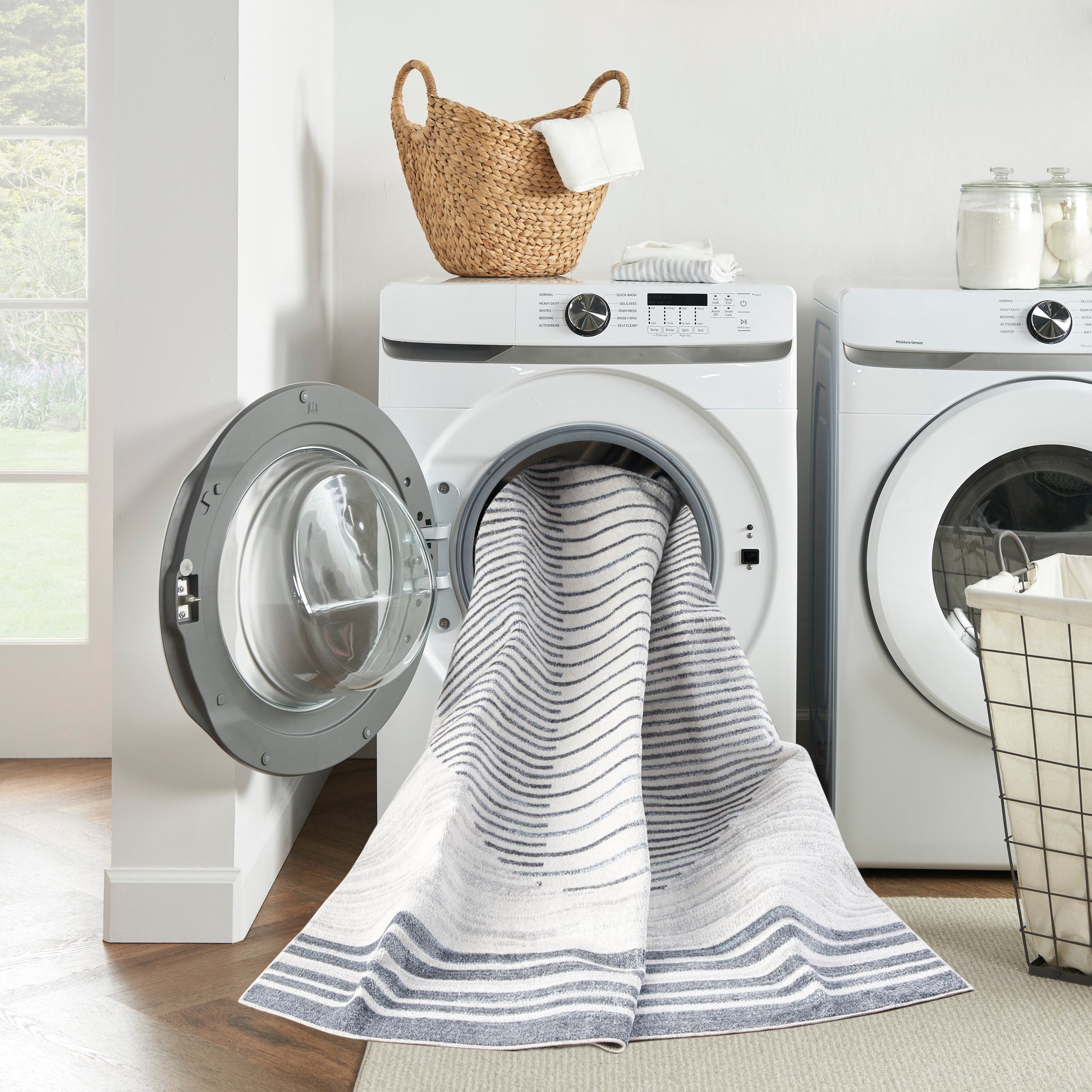 Invite a touch of Scandinavian charm to your home with this mid-century modern rug from the Astra Machine Washable Collection. The circular pattern is defined by striped edges in blue and silver grey, with a silky finish that shifts in tone under different lighting. This contemporary rug is designed for busy households with a machine-washable, low-pile construction.
