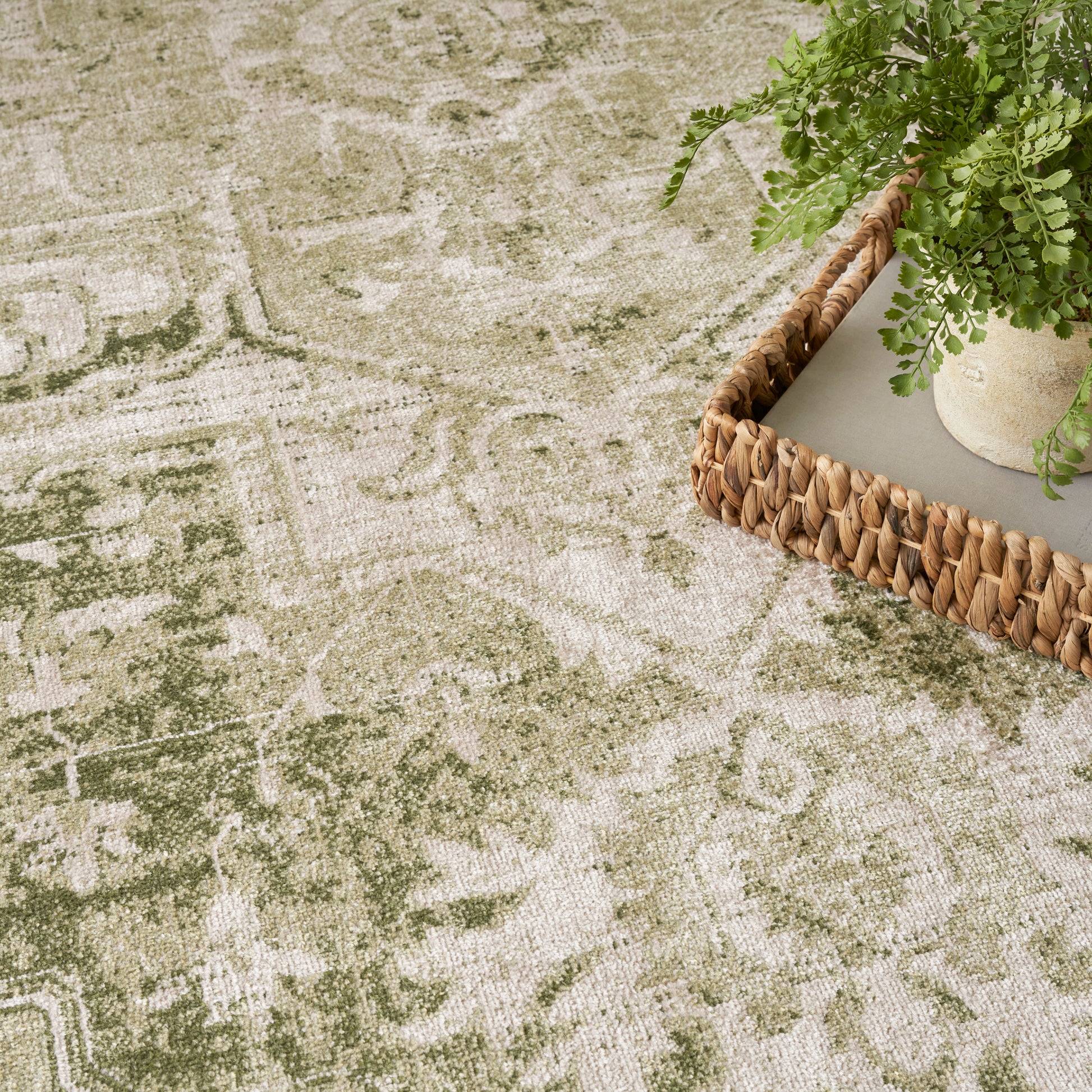 Invite a touch of old-world charm into your favorite space with this Persian rug from the Astra Machine Washable Collection. The heirloom-inspired design features an artfully faded green floral medallion pattern and matching border that beautifully defines farmhouse, boho, and vintage décor. This rug is designed for modern living with a low-profile, machine-washable pile and shimmering yarns that beautifully reflect shifting light.