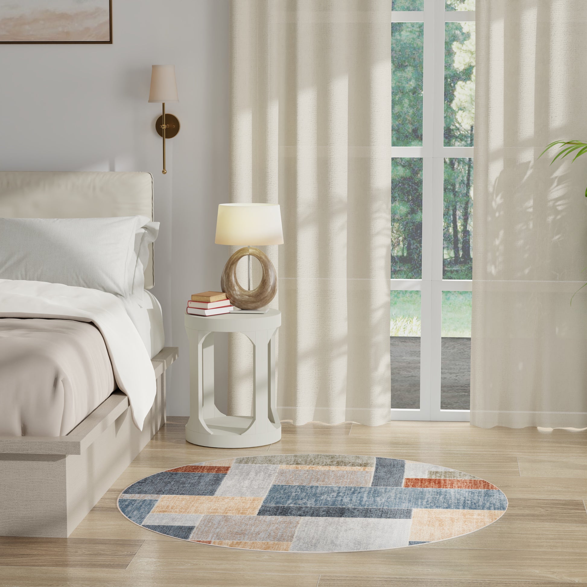 Make a bold statement with this contemporary rug from the Astra Machine Washable Collection. The softly textured surface features a muted color block pattern in shades of blue, silver, green, and rust, with a shimmery finish that shifts in tone under different light. Made from easy-clean yarns: simply place into your washing machine and air dry!