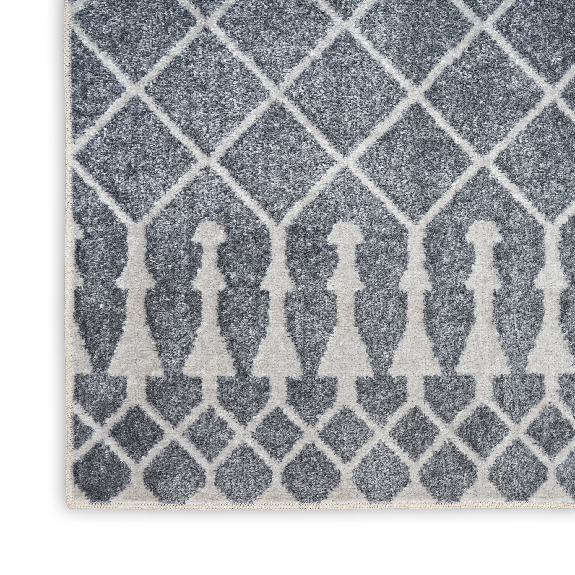 Bring global style home with this boho chic rug from the Astra Machine Washable Collection. Presented in denim blue and ivory, the classic Moroccan trellis pattern is finished with a vibrant sheen that shifts in tone under different light. This machine-washable rug beautifully complements modern and farmhouse décor.