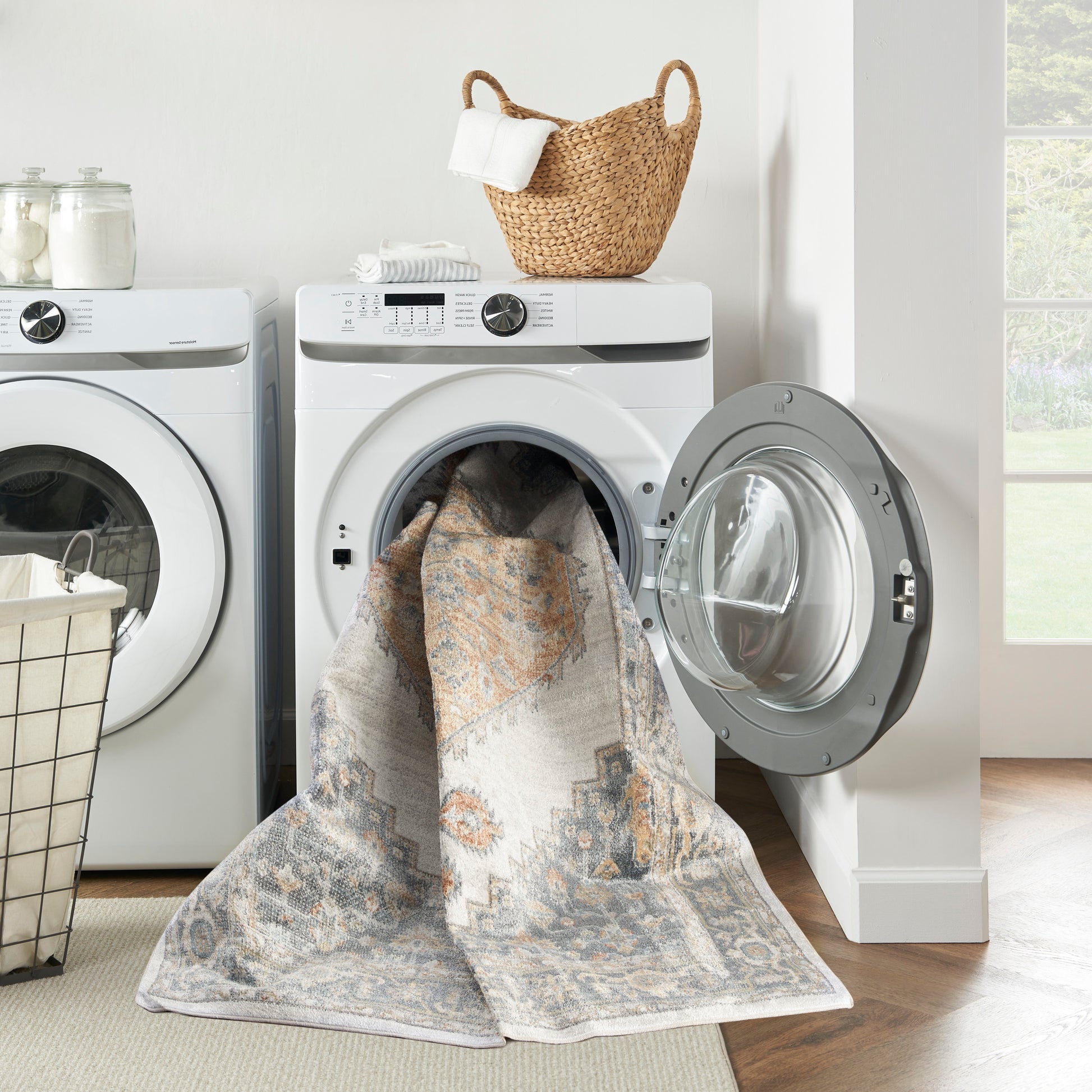 Vintage meets modern with this Persian rug from the Astra Machine Washable Collection. Featuring an artfully faded floral medallion pattern in blue and orange multicolor, the classic design is enhanced with a brilliant sheen that shifts in tone under different lighting. This vintage-inspired rug is machine-washable for fuss-free cleaning, making it an ideal addition to busy households with pets and kids.