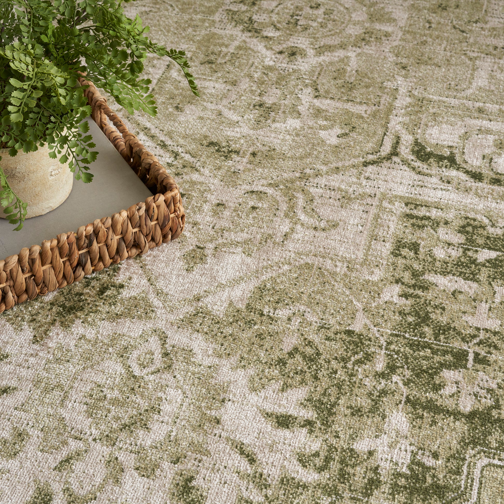 Invite a touch of old-world charm into your favorite space with this Persian rug from the Astra Machine Washable Collection. The heirloom-inspired design features an artfully faded green floral medallion pattern and matching border that beautifully defines farmhouse, boho, and vintage décor. This rug is designed for modern living with a low-profile, machine-washable pile and shimmering yarns that beautifully reflect shifting light.