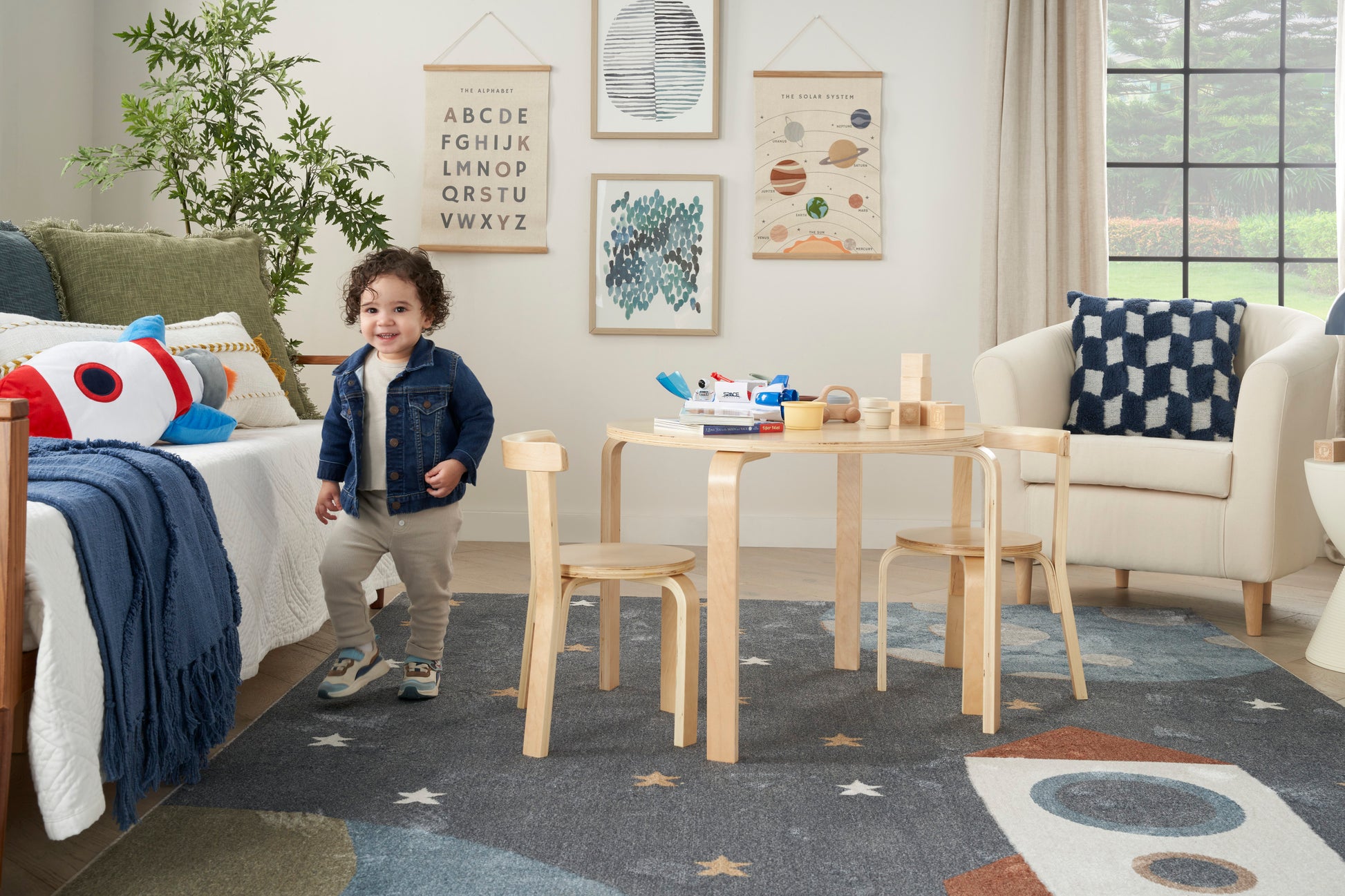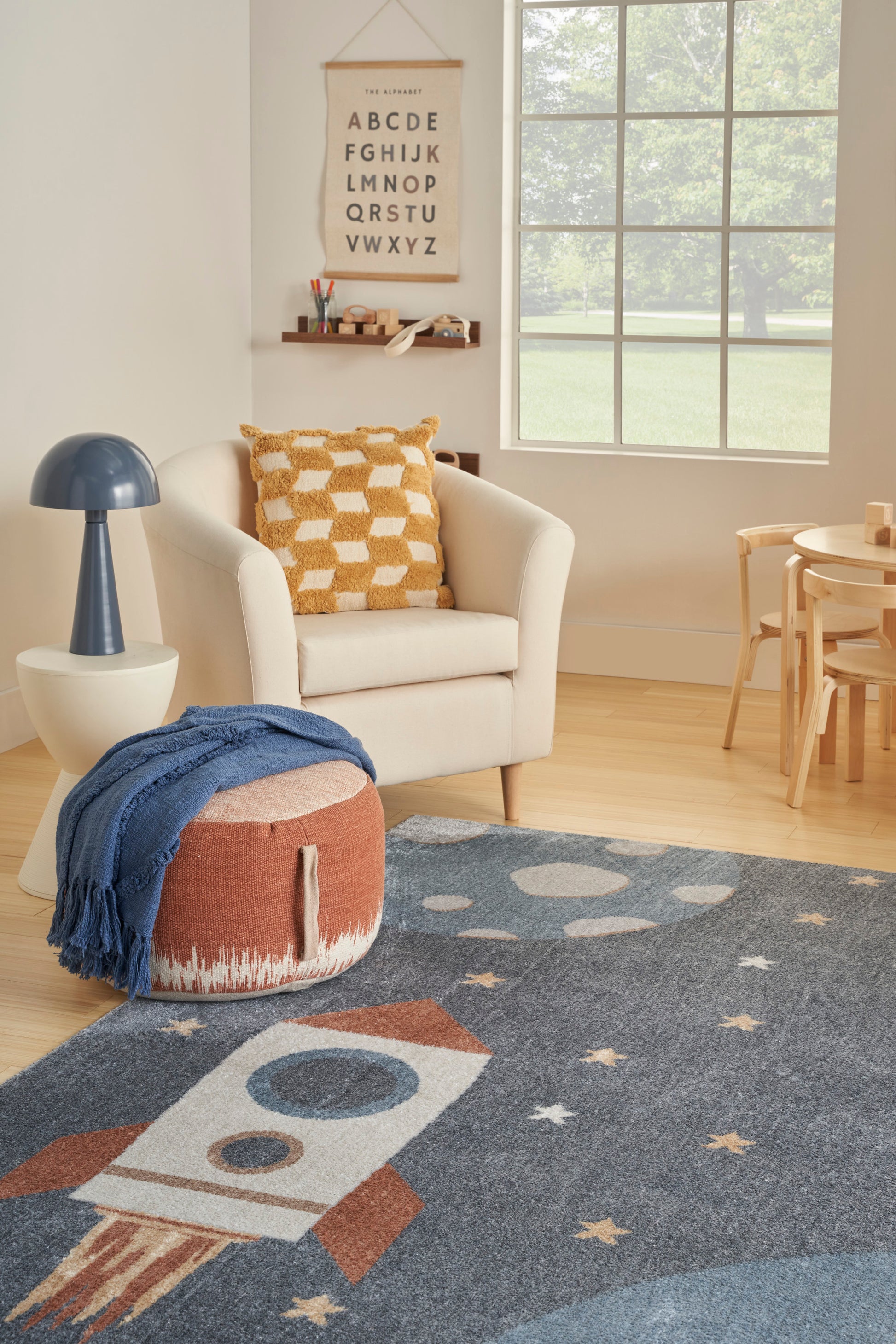 Zoom away to new frontiers with this kids rug from the Astra Machine Washable Collection. A soft multicolored rocket soars through space on a blue background, inspiring dreams and hours of imaginative play in your child's playroom or bedroom. This machine-washable rug is made from soft, shimmery yarns that shift tones with changing light.