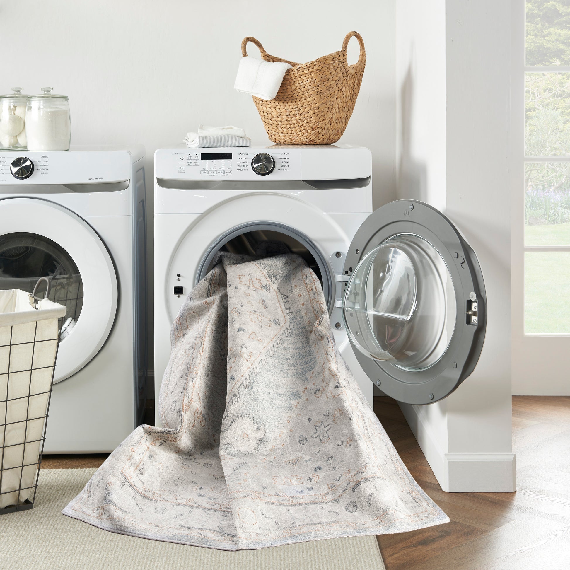 Vintage meets modern with this Persian rug from the Astra Machine Washable Collection. Featuring an artfully faded floral medallion pattern in light blue, the classic design is enhanced with a brilliant sheen that shifts in tone under different lighting. This vintage-inspired rug is machine-washable for fuss-free cleaning, making it an ideal addition to busy households with pets and kids.