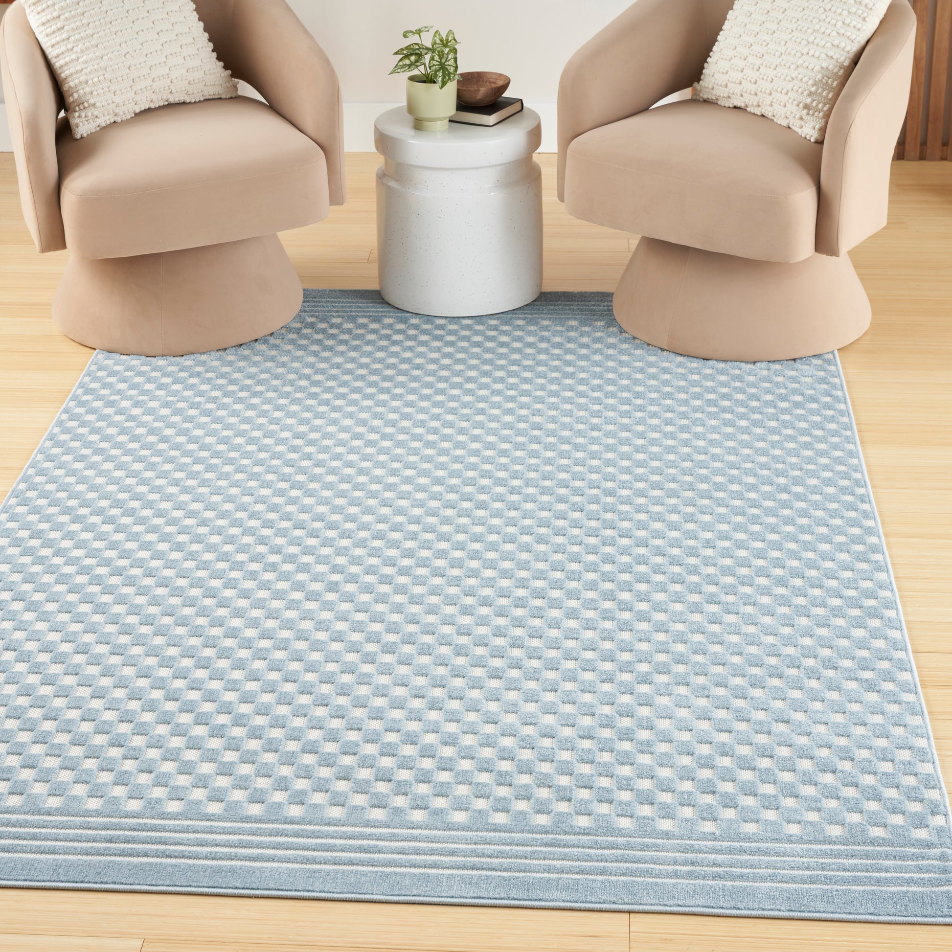 Playful with a touch of chic, this blue checkerboard rug from the Care Free Collection adds an instant boost of coziness to virtually any space. The timeless pattern adds a fun pop of dimension thanks to a high-low raised texture that feels incredibly soft to the touch. Made for modern living from hard-wearing polypropylene that’s easy to clean: simply spot clean spills with a clean white cloth to keep your rug looking fresh.
