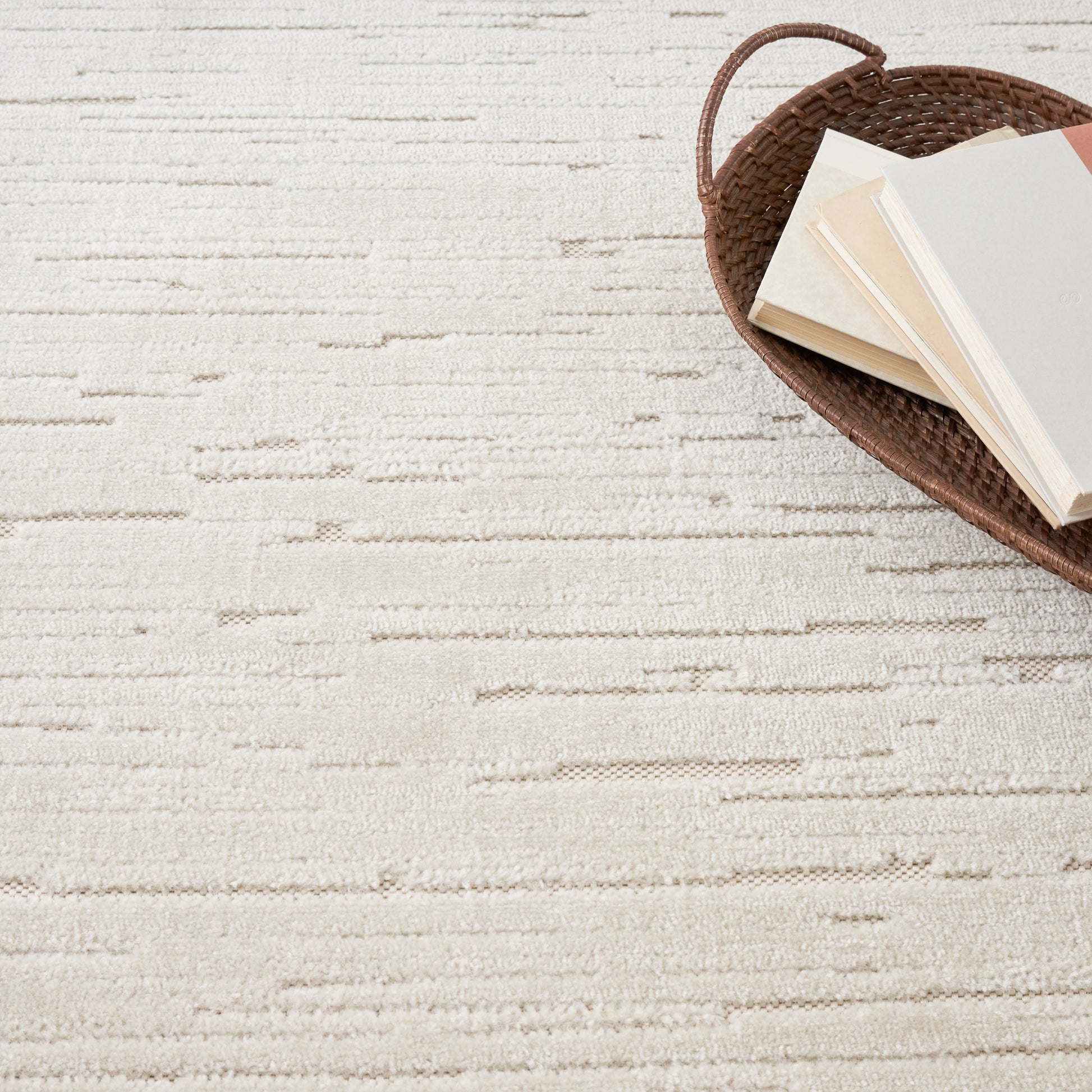 Invite relaxed style to your favorite spaces with this beige textured rug from the Care Free Collection. The simple, solid background is marked by abstract lines in a high-low, cutout style design that adds an intriguing sense of depth. Made from easy-clean polypropylene fibers that feel incredibly soft to the touch, which is ideal for busy families with young kids and pets.