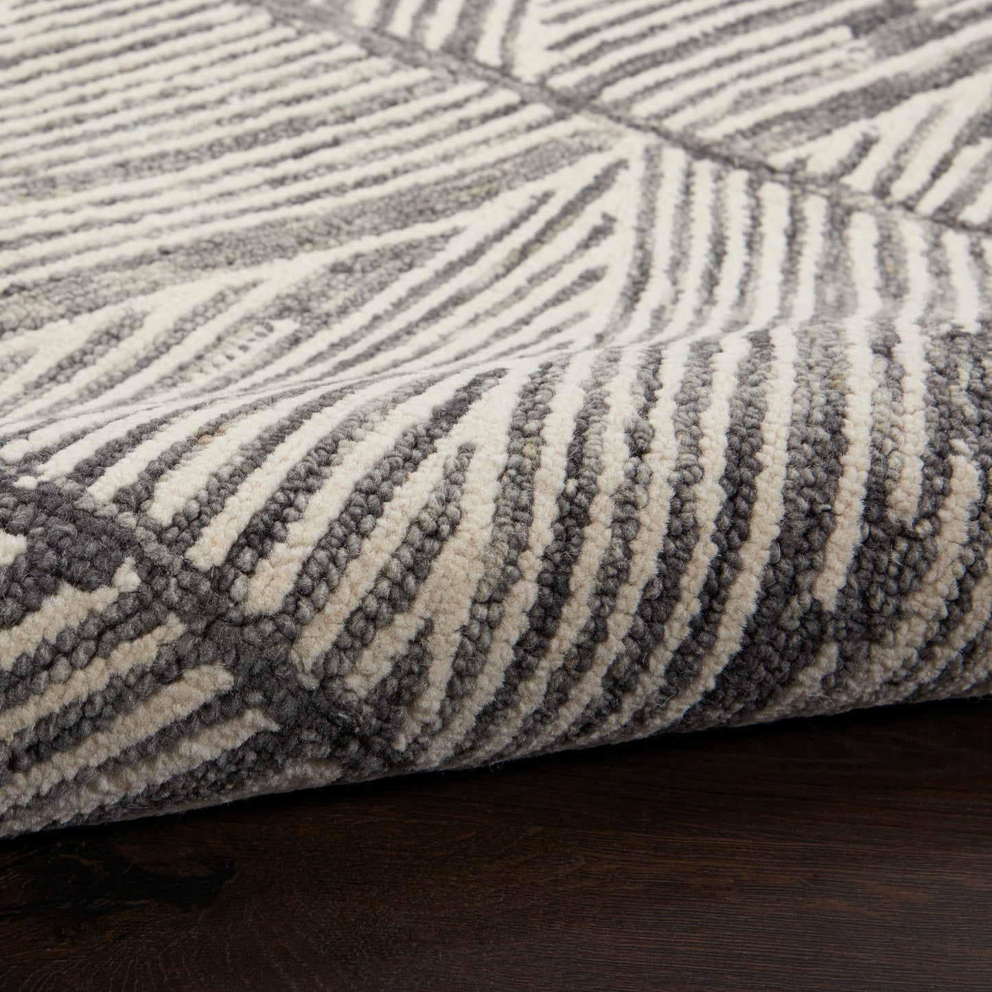 Bold and textural as tree bark, the graphic lines of this Colorado rug design move in counterpoint for a look as fresh as a mountain breeze. Its hand-tufted, loop pile lends an artisanal feel. Made of low-shed wool for both softness and durability, in a contemporary grey and white duotone.