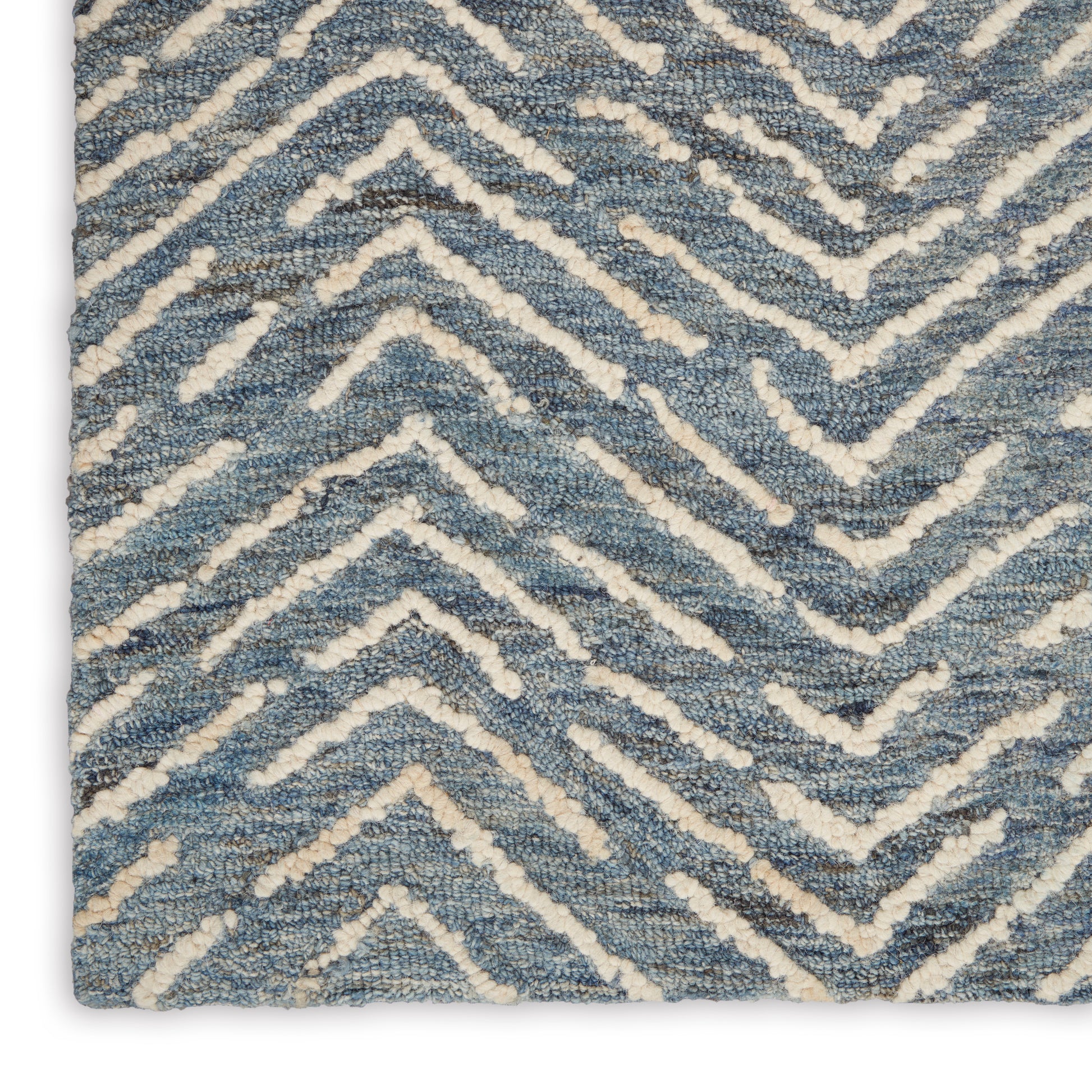 Rows of chevrons move like arrowheads across the textural surface of this free-spirited Colorado Collection area rug. Its artisanal, hand-tufted loop pile is irresistible to the touch. Enjoy the softness and durability of its easy-care, low-shed wool fibers in versatile indigo and ivory.