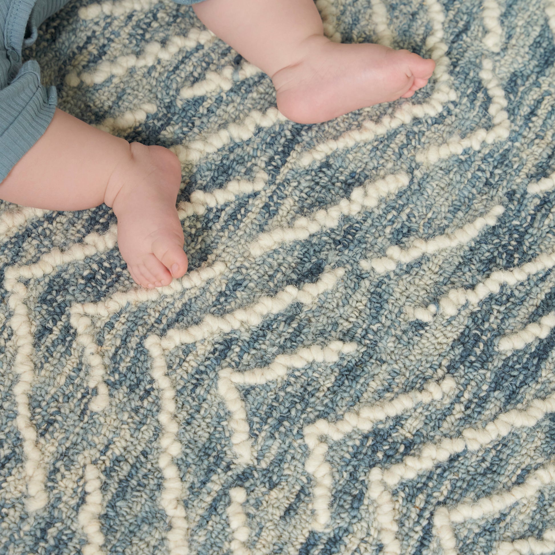 Rows of chevrons move like arrowheads across the textural surface of this free-spirited Colorado Collection area rug. Its artisanal, hand-tufted loop pile is irresistible to the touch. Enjoy the softness and durability of its easy-care, low-shed wool fibers in versatile indigo and ivory.