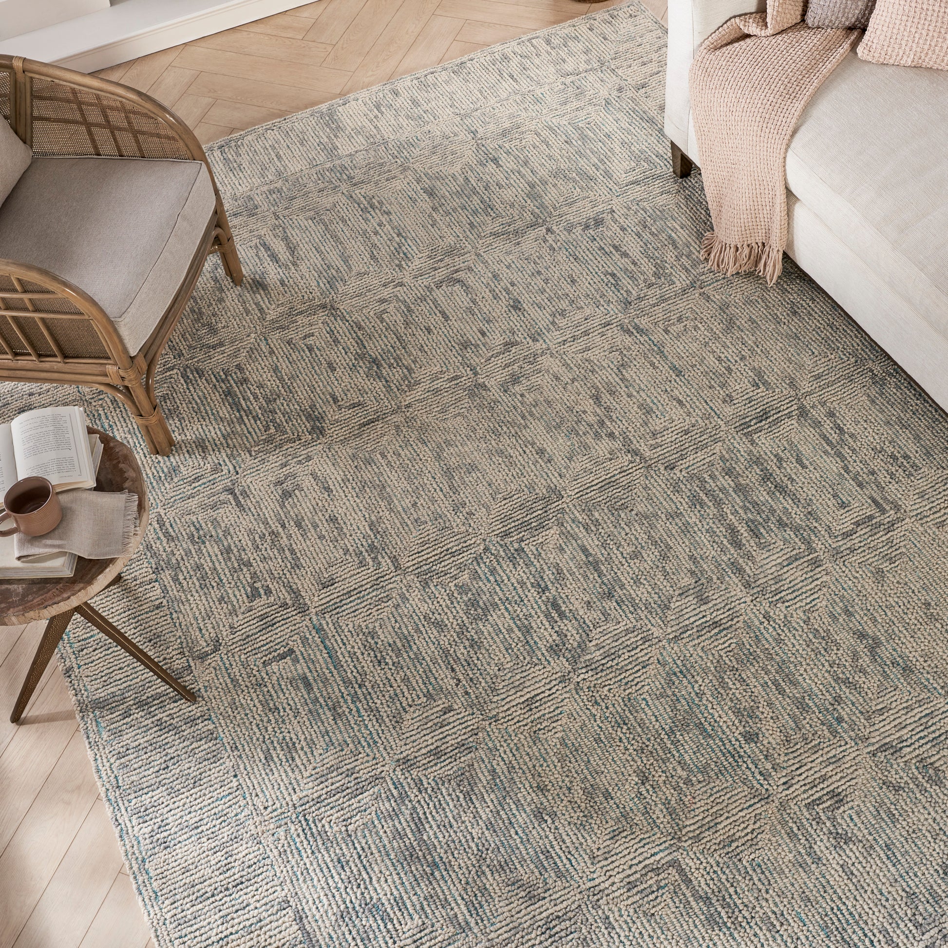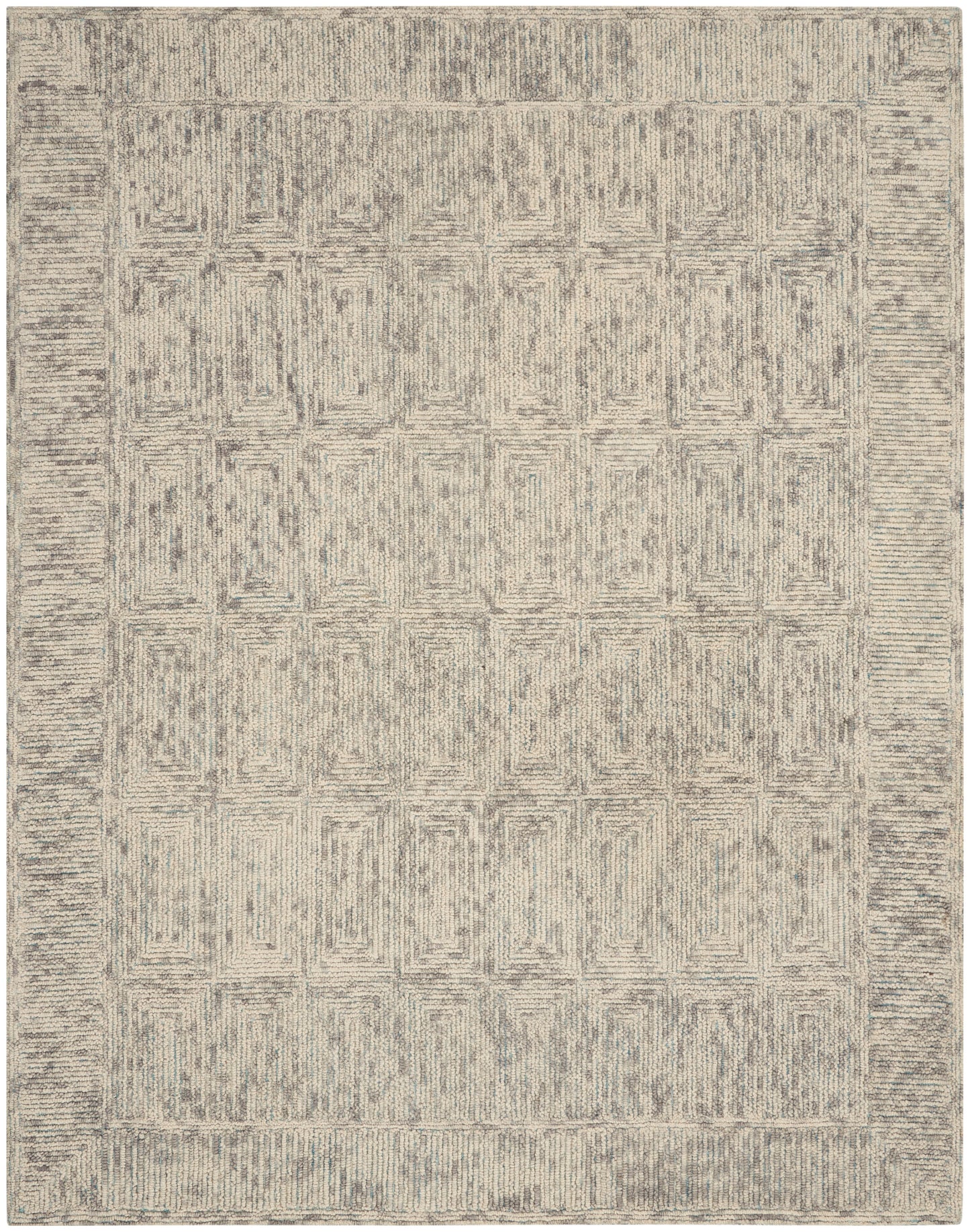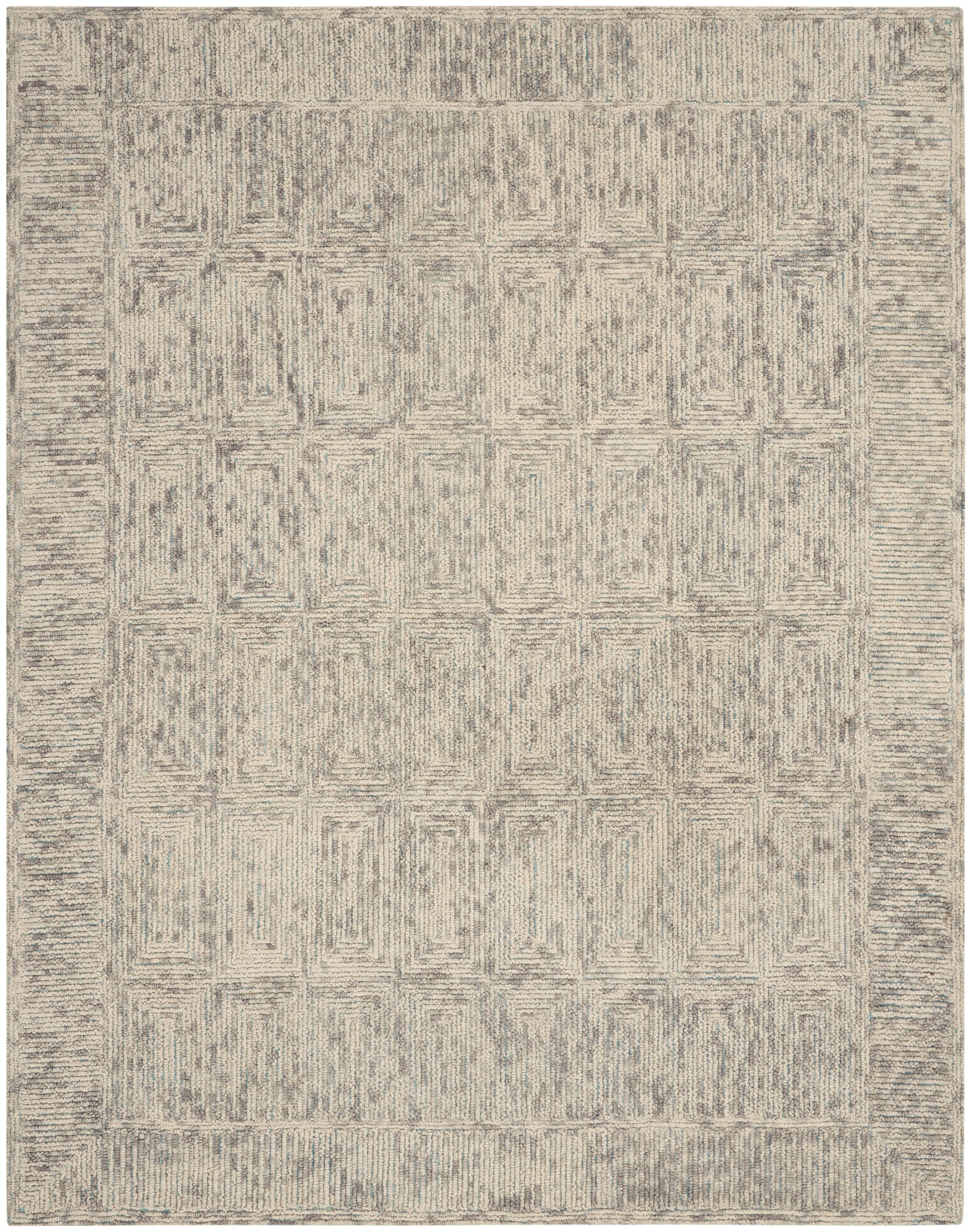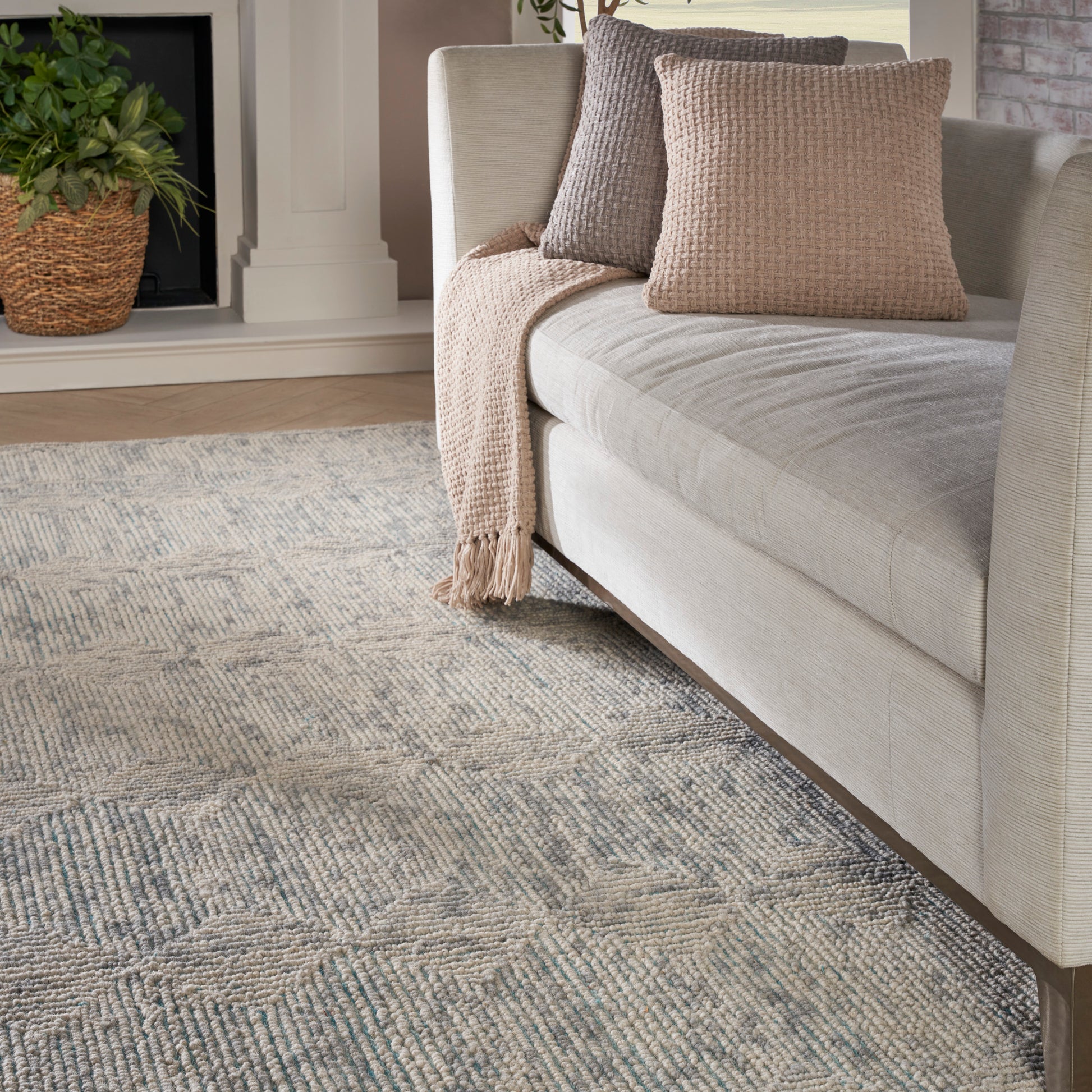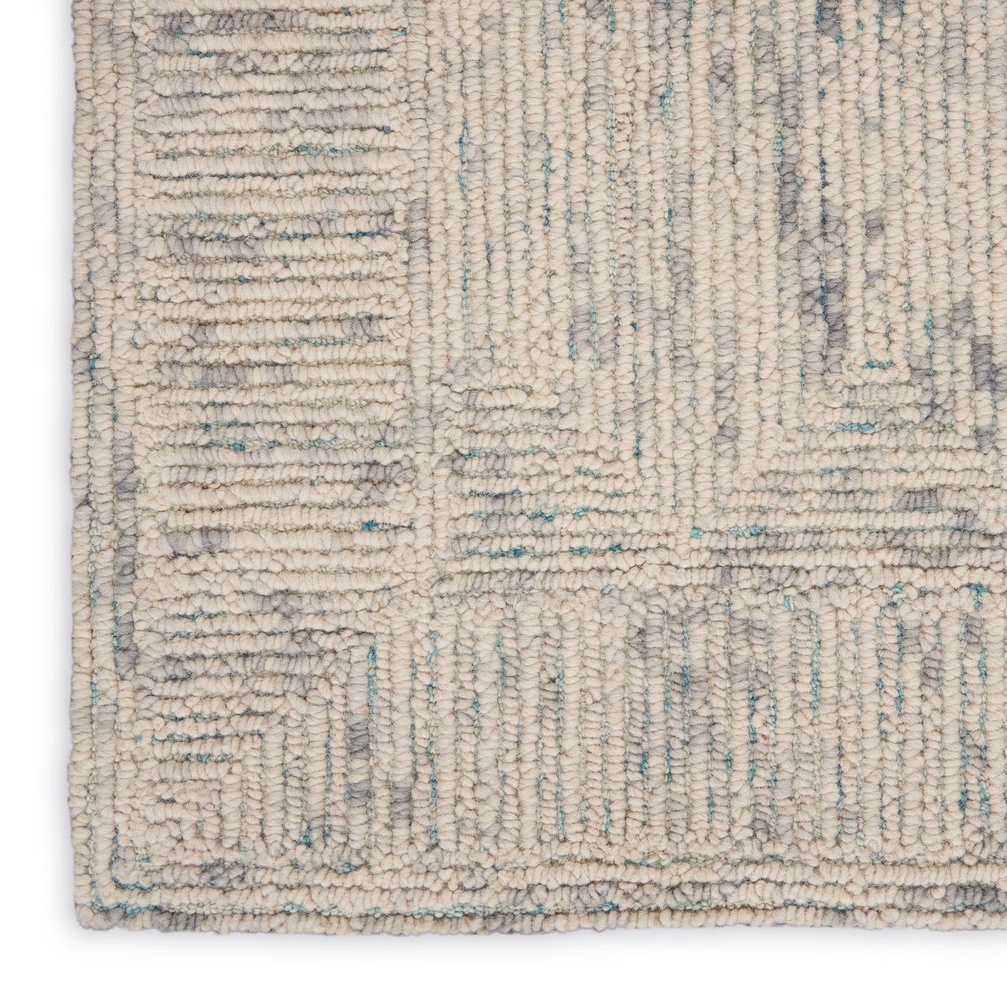 Hypnotic rectangular rhythms are shaped into the hand-tufted, loop pile of this Colorado area rug. Its richly textured surface presents a subtle shadow-play that invites admiration. Engaging and versatile for decorating in a modern color combo of ivory and grey touched with teal.