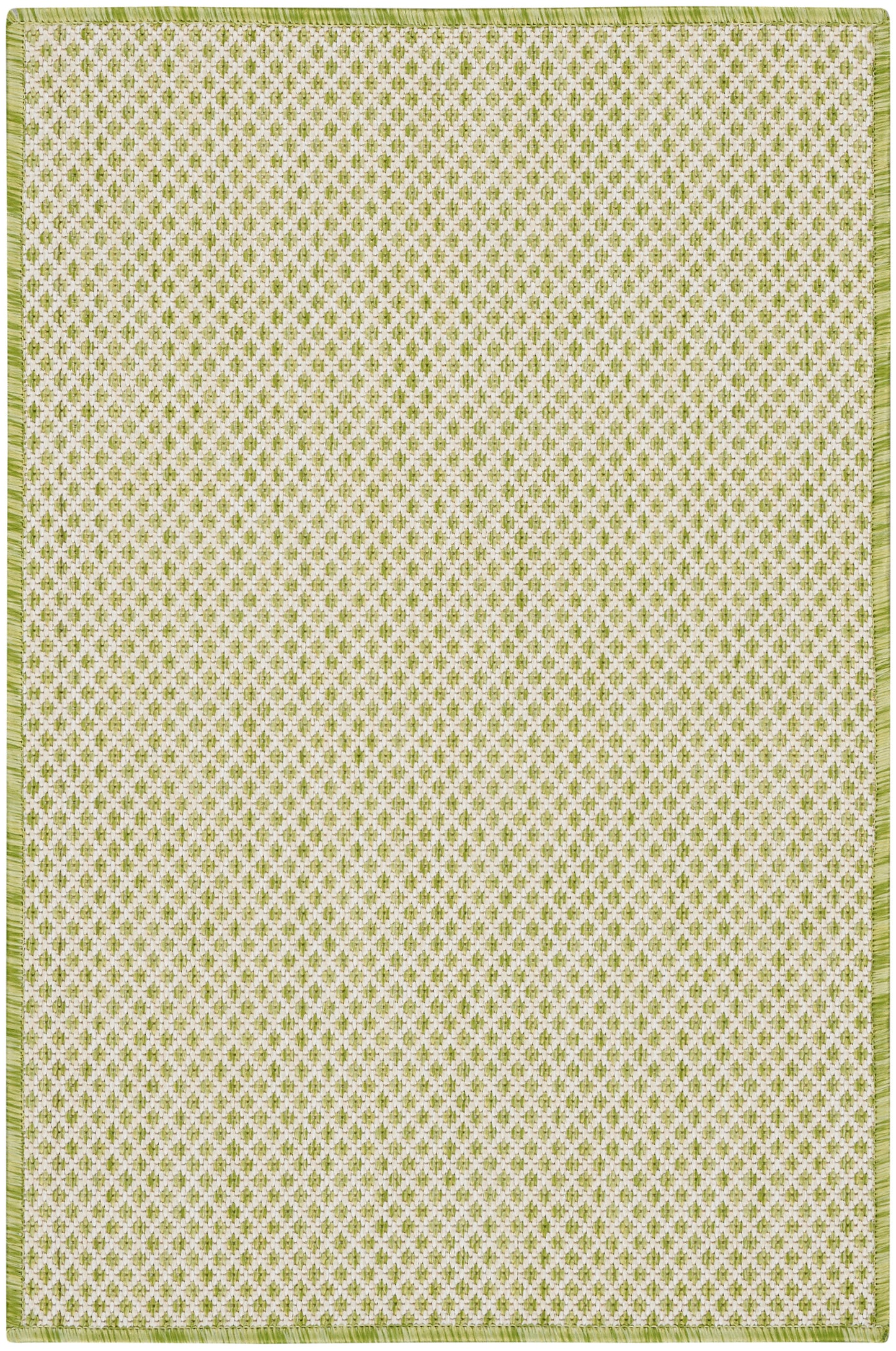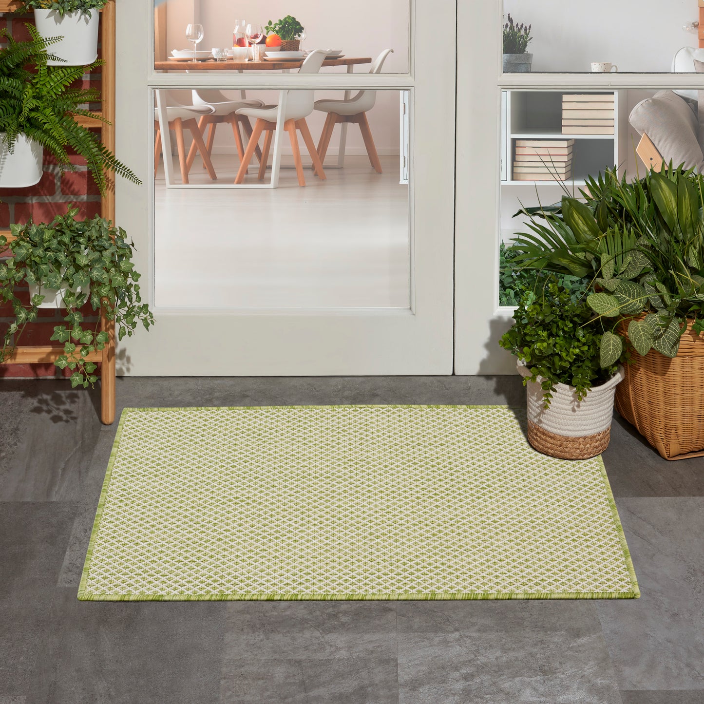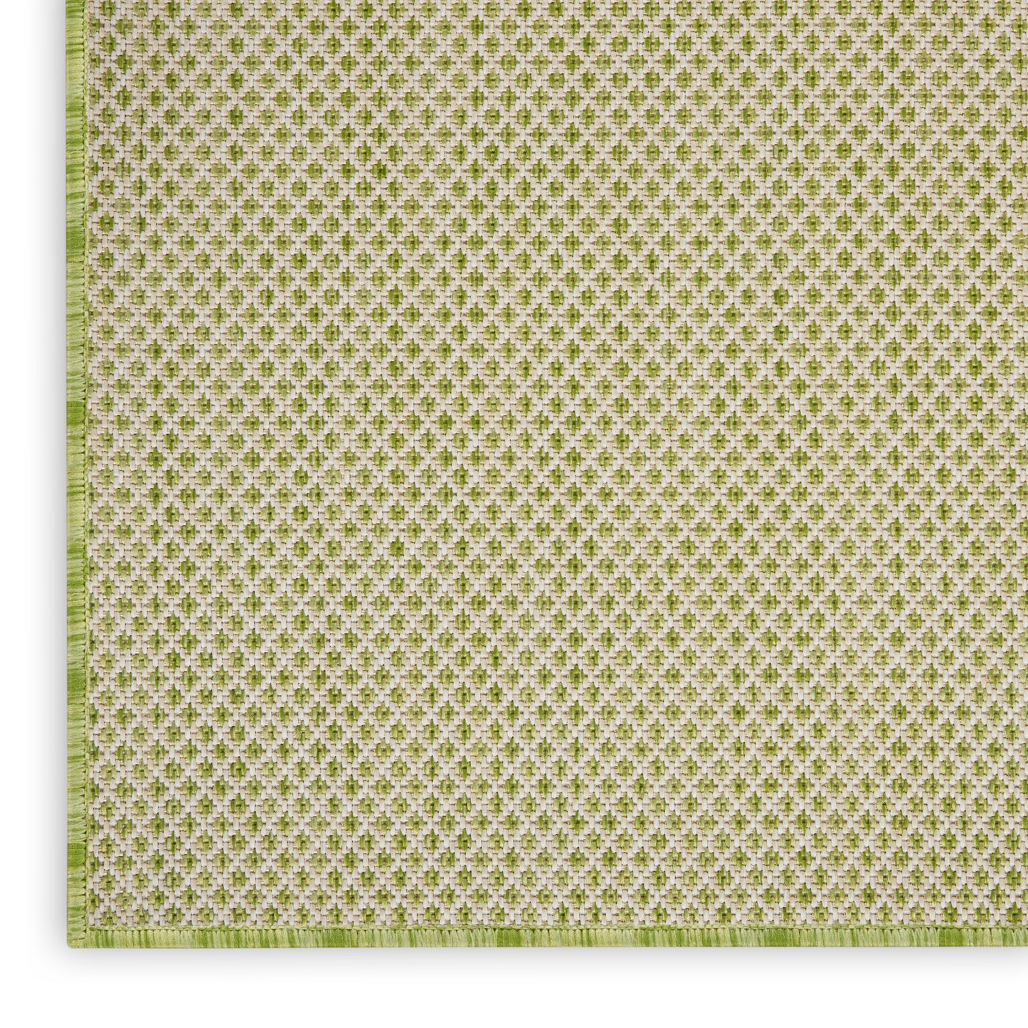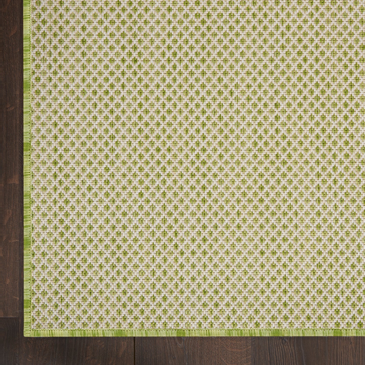 With its striking geometric pattern, this Courtyard Collection outdoor rug exudes contemporary style. Its subtly textured surface is crafted in classic ivory and green for a seamless complement to modern settings. Machine made from a blend of polypropylene and polyester in a flatweave style that stands up to heavy traffic. Easily washable outdoors: just hose-rinse and air dry.