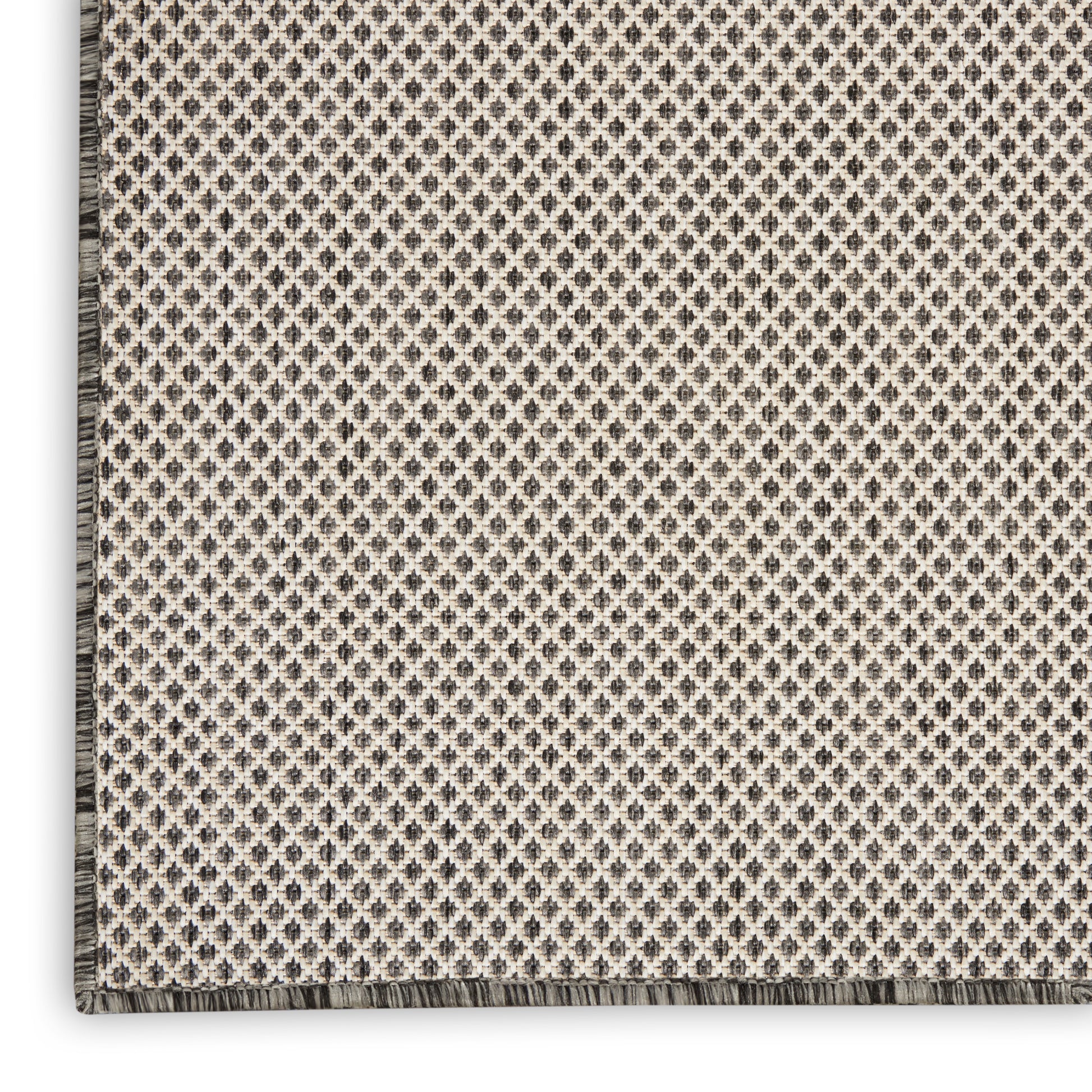 With its striking geometric pattern in ivory and charcoal grey, this Courtyard Collection outdoor rug exudes contemporary style. Its subtly textured surface is crafted in classic ivory and aqua blue for a seamless complement to modern settings. Machine made polypropylene flat weave stands up to heavy traffic and is easy to clean: just hose-rinse and air dry.