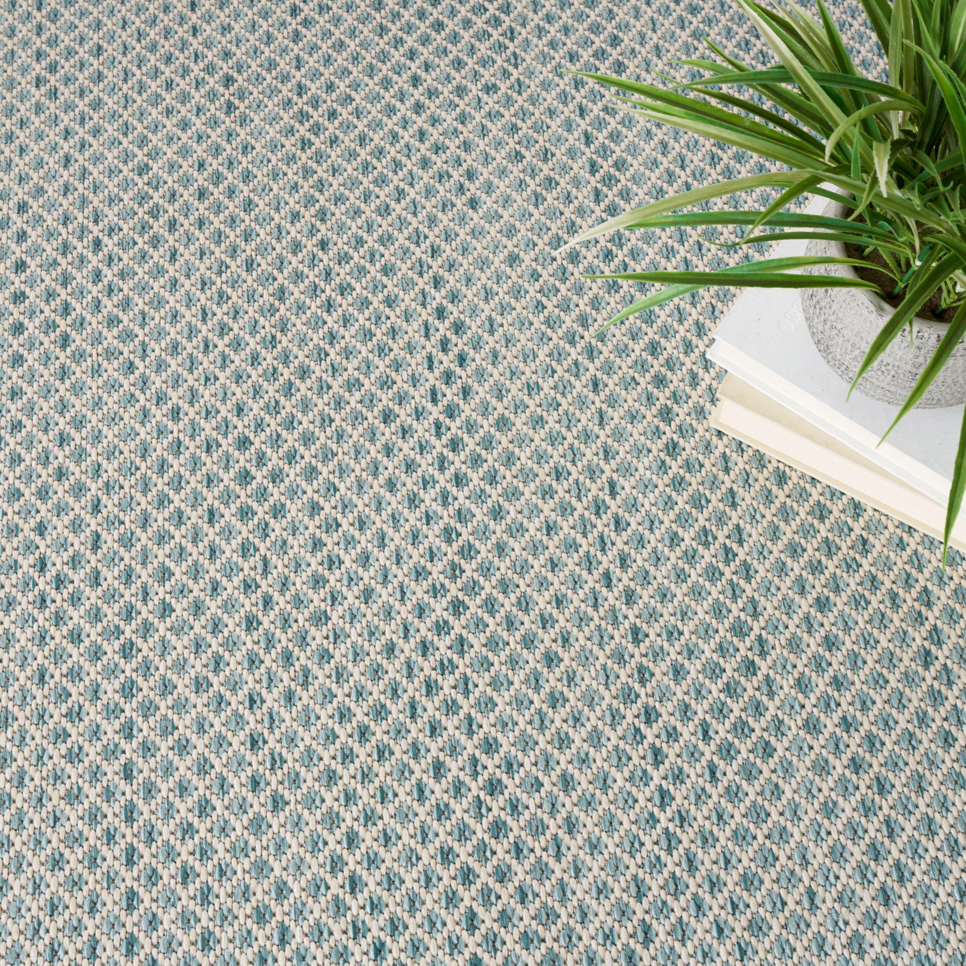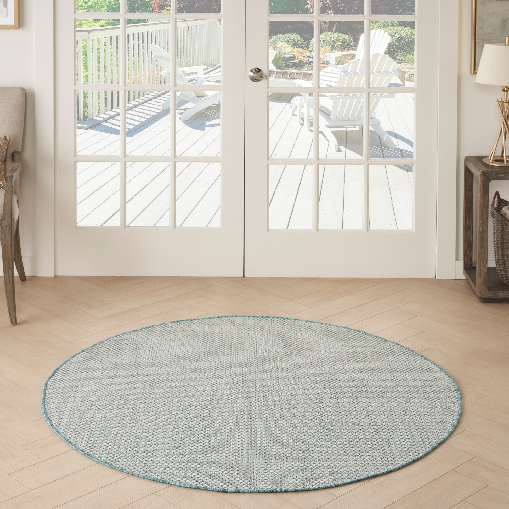 With its striking geometric pattern, this Courtyard Collection outdoor rug exudes contemporary style. Its subtly textured surface is crafted in classic ivory and aqua blue for a seamless complement to modern settings. Machine made from a blend of polypropylene and polyester in a flatweave style that stands up to heavy traffic. Easily washable outdoors: just hose-rinse and air dry.