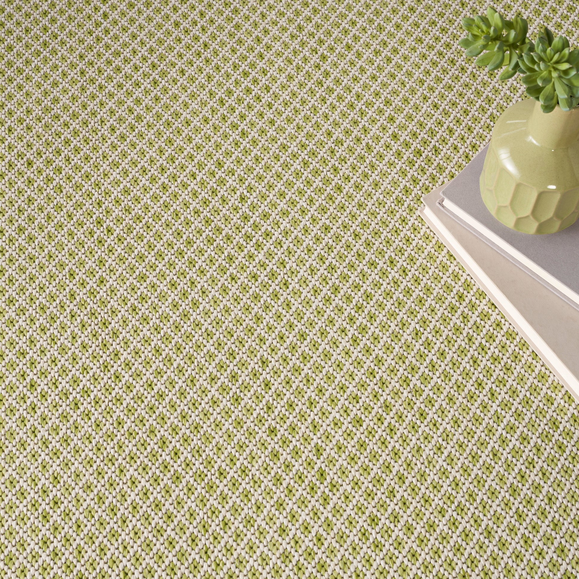 With its striking geometric pattern, this Courtyard Collection outdoor rug exudes contemporary style. Its subtly textured surface is crafted in classic ivory and green for a seamless complement to modern settings. Machine made from a blend of polypropylene and polyester in a flatweave style that stands up to heavy traffic. Easily washable outdoors: just hose-rinse and air dry.