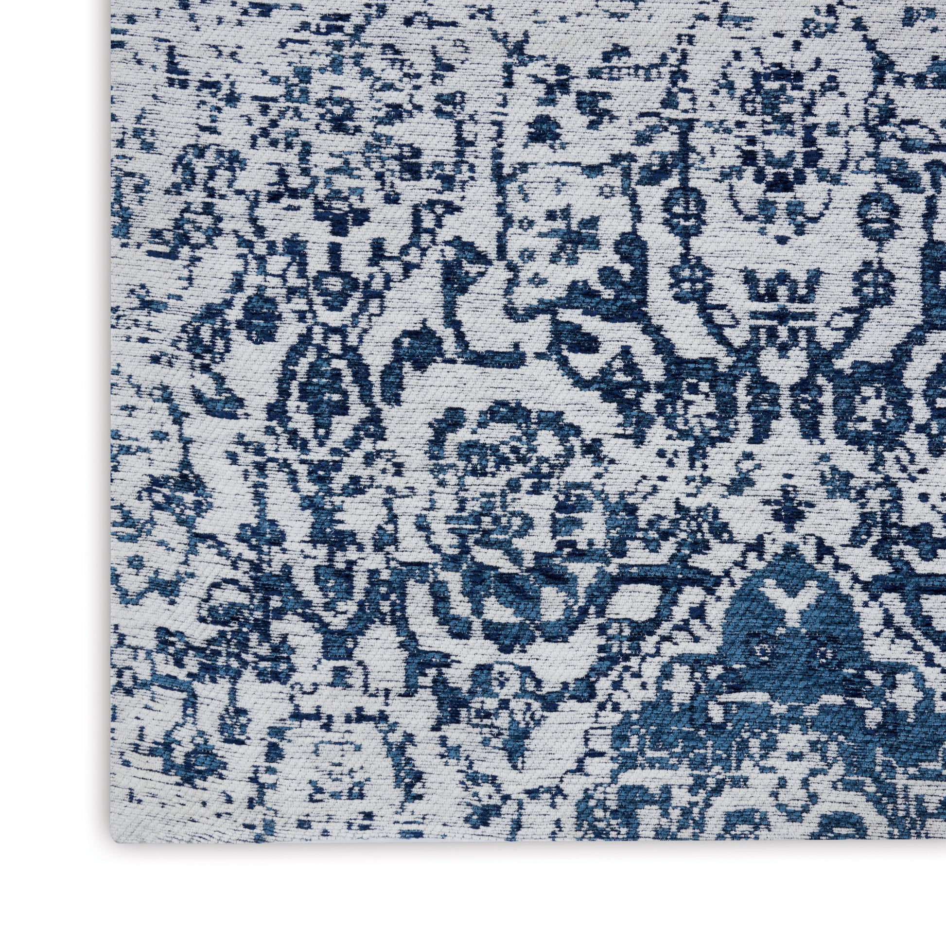 The faded effect of a time-worn antique creates mysterious beauty in this Damask area rug, a Nourison exclusive. Delicate floral medallions are joined by flowing vines in a stunning navy-on-ivory palette. Soft as a dream in jacquard-woven chenille.