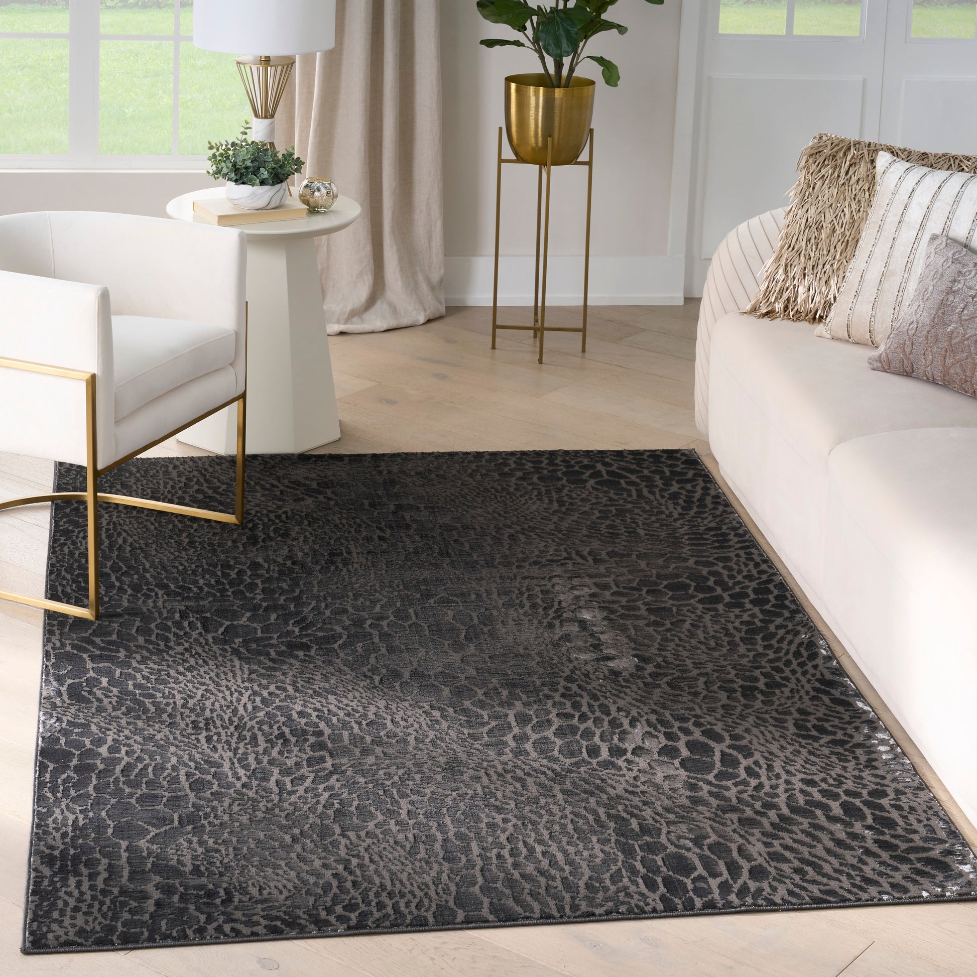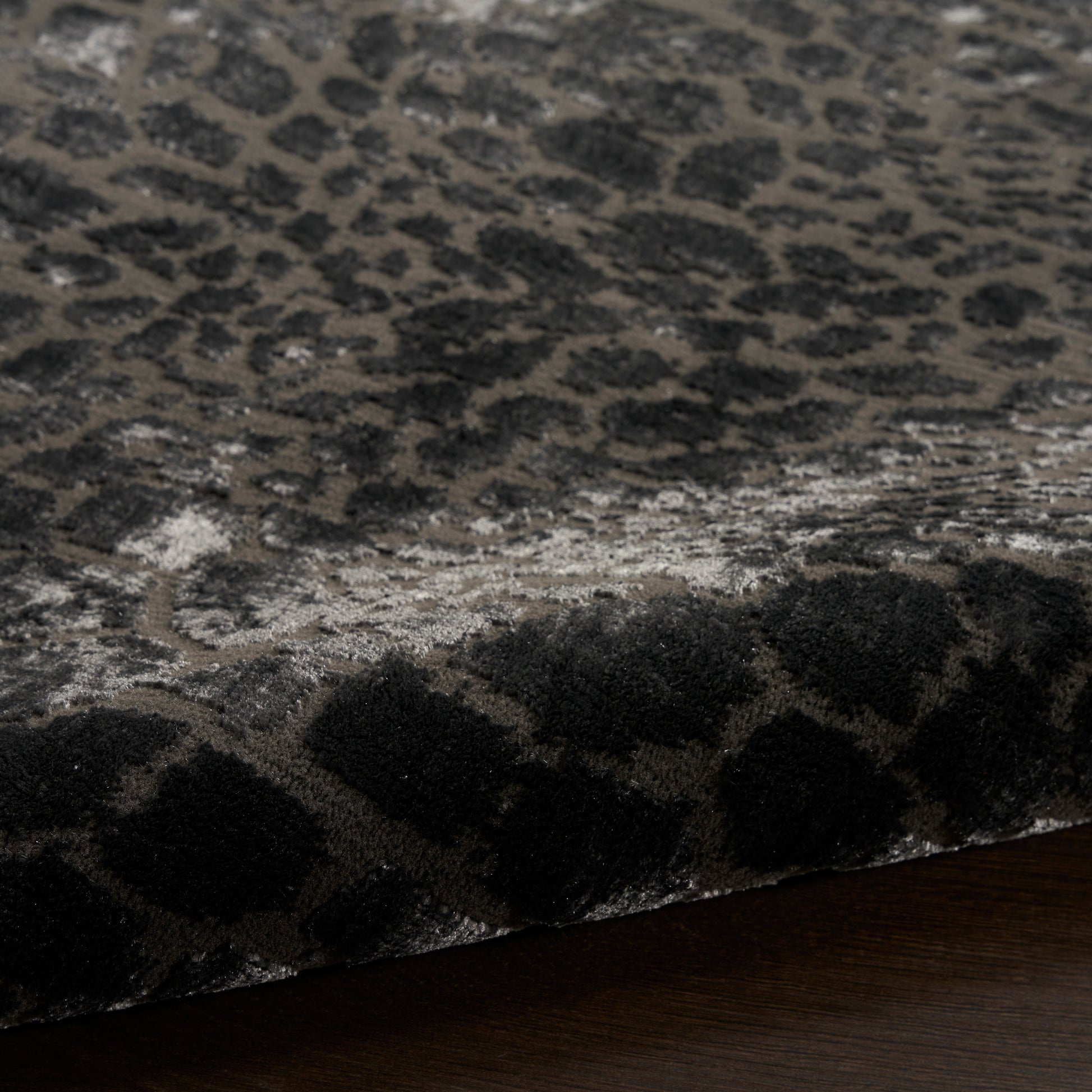 Invite wild energy into your favorite spaces with this charcoal grey animal print rug from the Desire collection. The abstract spotted pattern adds a cool and modern look to the living room, bedroom, or dining room. Desire is machine-made with 100% polyester fibers for fuss-free cleaning and is finished with a brilliant sheen that captures and reflects light.