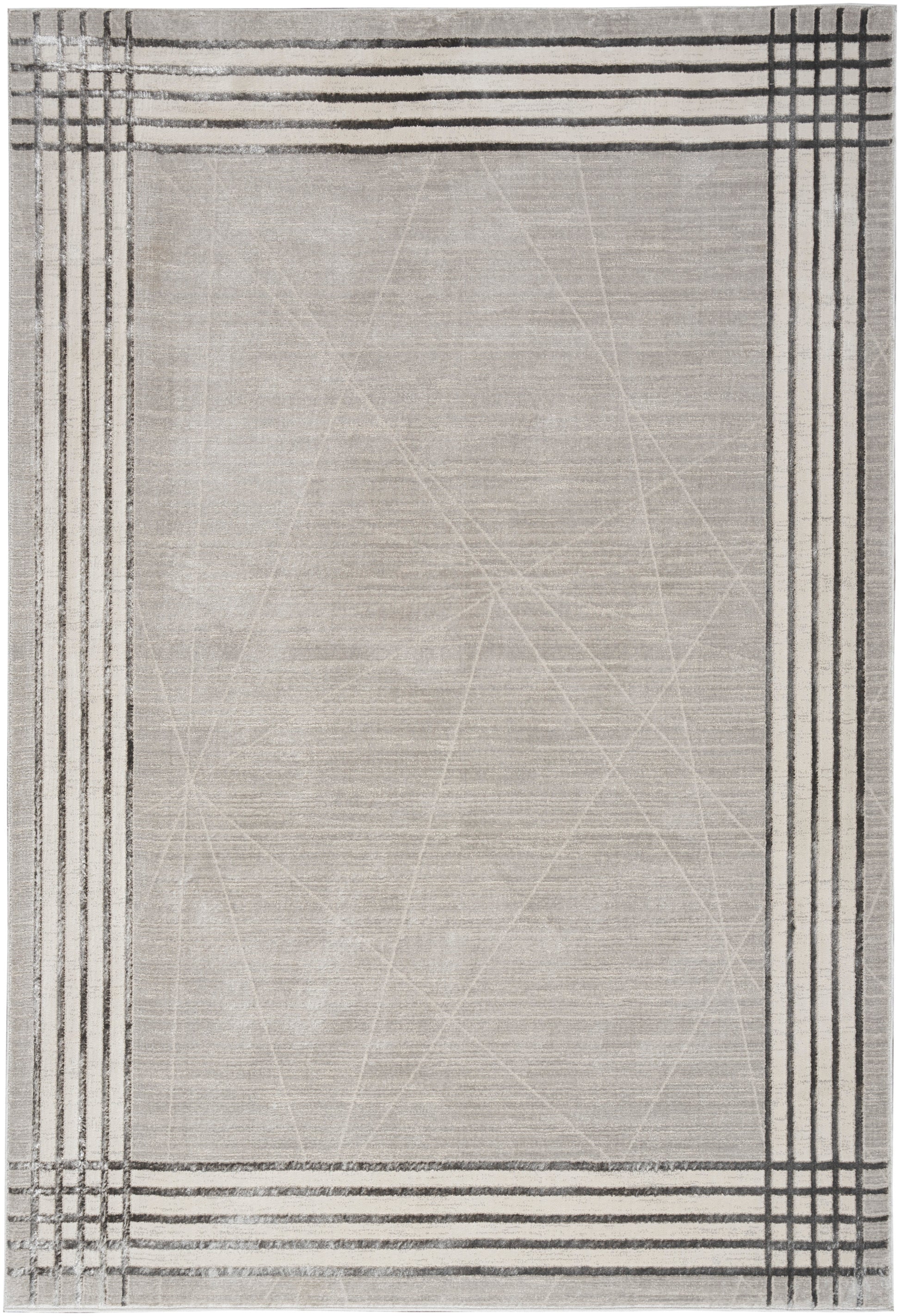 Refresh your space with the clean linear pattern of this abstract rug from the Desire Collection. The heathered grey base is overlaid with a broken stripe design, contrasting charcoal and white linear border, and subtly carved accents that create visual interest. Made from polyester yarns finished with an eye-catching shimmer that changes from black to silver with changes in light, this modern rug is great for busy households with a low-profile, easy to clean construction.