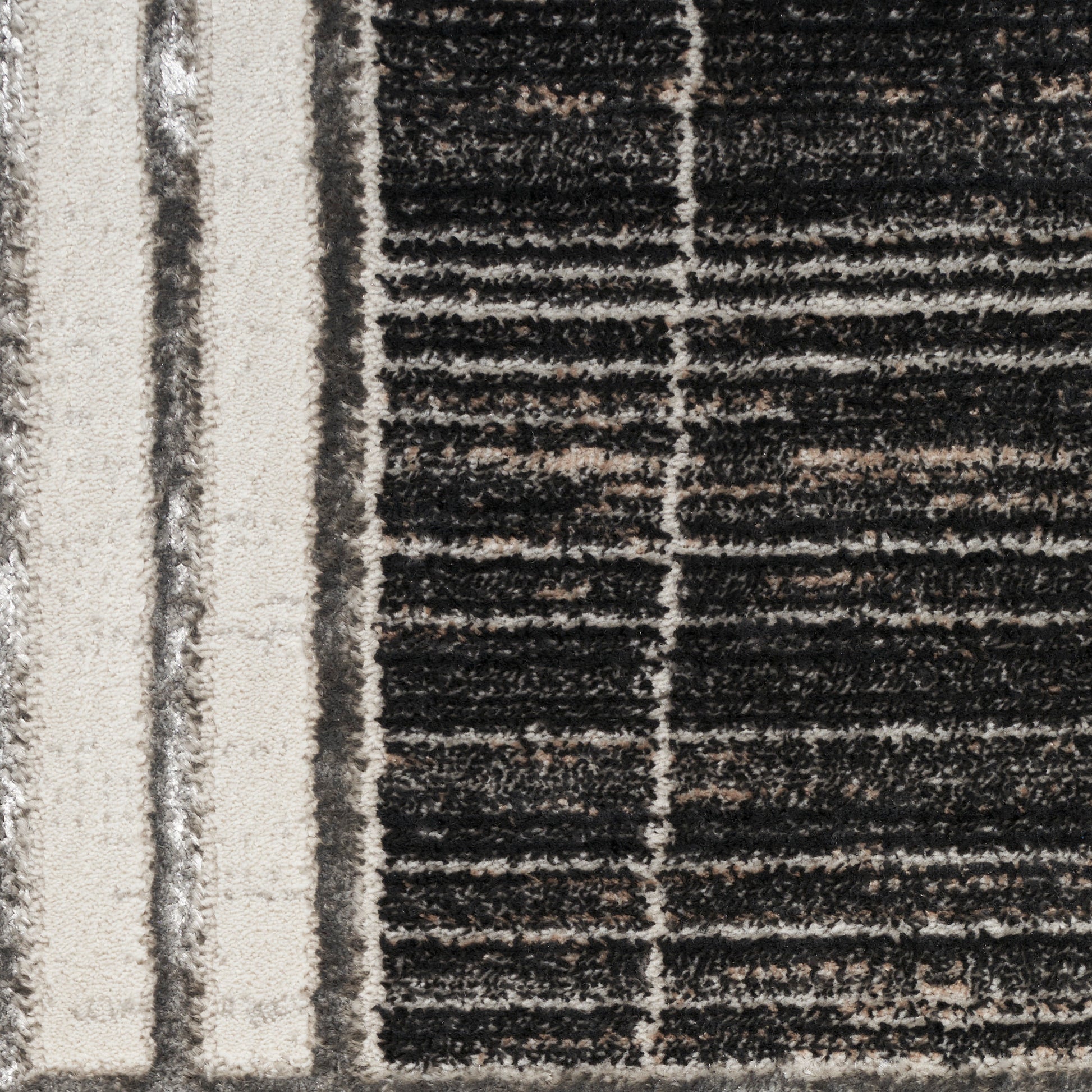 Refresh your space with the clean linear pattern of this geometric rug from the Desire Collection. The heathered dark grey base is overlaid with a broken stripe design, contrasting charcoal and white linear border, and subtly carved accents that create visual interest. Made from polyester yarns finished with an eye-catching shimmer that changes from black to silver with changes in light, this modern rug is great for busy households with a low-profile, easy to clean construction.
