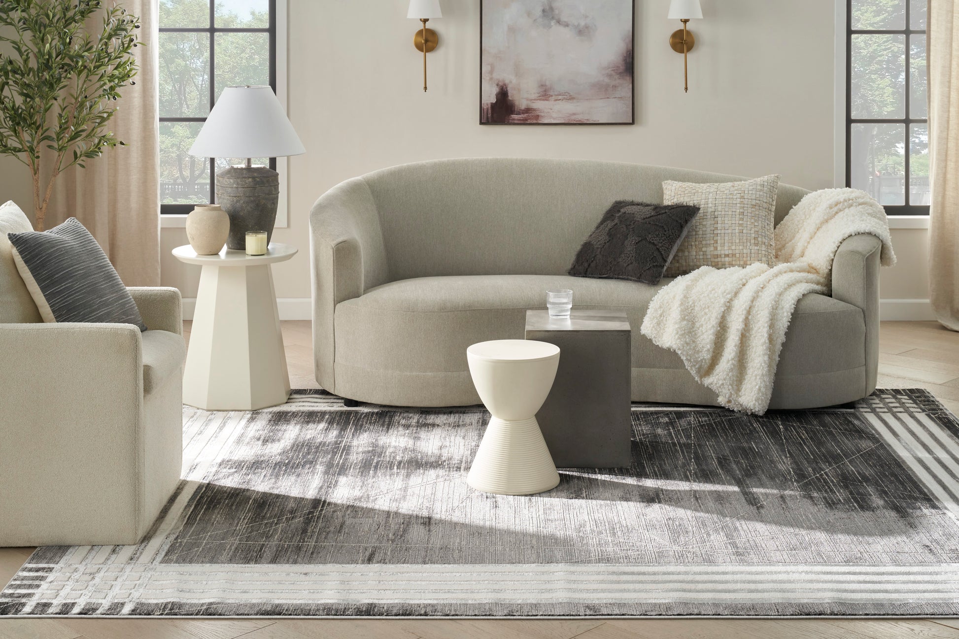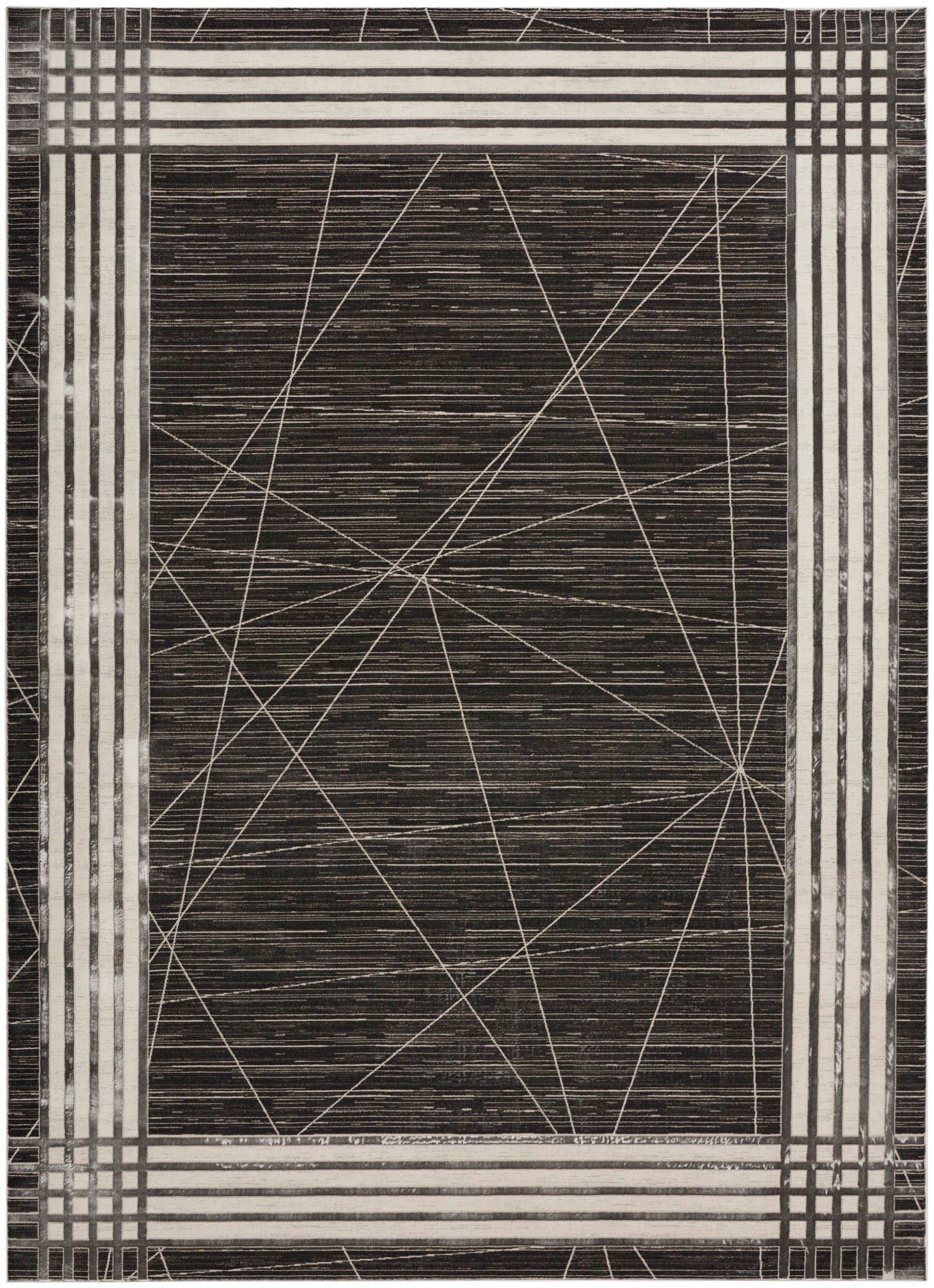 Refresh your space with the clean linear pattern of this geometric rug from the Desire Collection. The heathered dark grey base is overlaid with a broken stripe design, contrasting charcoal and white linear border, and subtly carved accents that create visual interest. Made from polyester yarns finished with an eye-catching shimmer that changes from black to silver with changes in light, this modern rug is great for busy households with a low-profile, easy to clean construction.