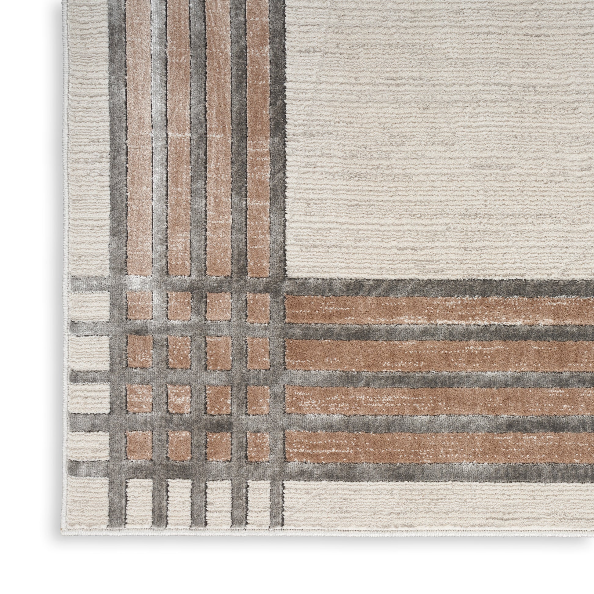 Refresh your space with the clean linear pattern of this geometric rug from the Desire Collection. The heathered ivory base is overlaid with a broken stripe design, contrasting charcoal and tan linear border, and subtly carved accents that create visual interest. Made from polyester yarns finished with an eye-catching shimmer that changes from black to silver with changes in light, this modern rug is great for busy households with a low-profile, easy to clean construction.
