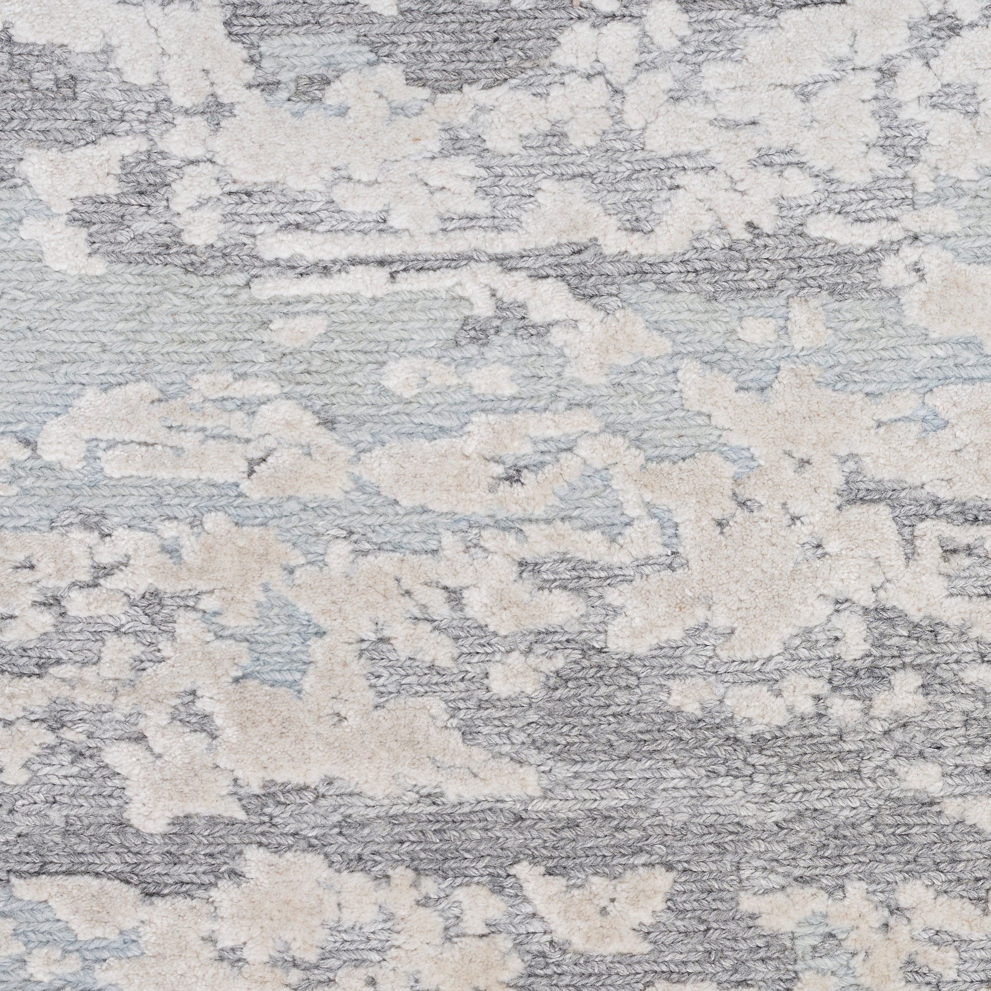 In an exquisite fusion of natural forms and abstract artistry, this modern rug from the Divine Collection brings organic energy to your space. Presented in soft shades of aqua, grey, and ivory, with shimmering accents that shift beautifully with changes in light. Hand-knotted from a blend of fine New Zealand wool and silky Luxcelle™.