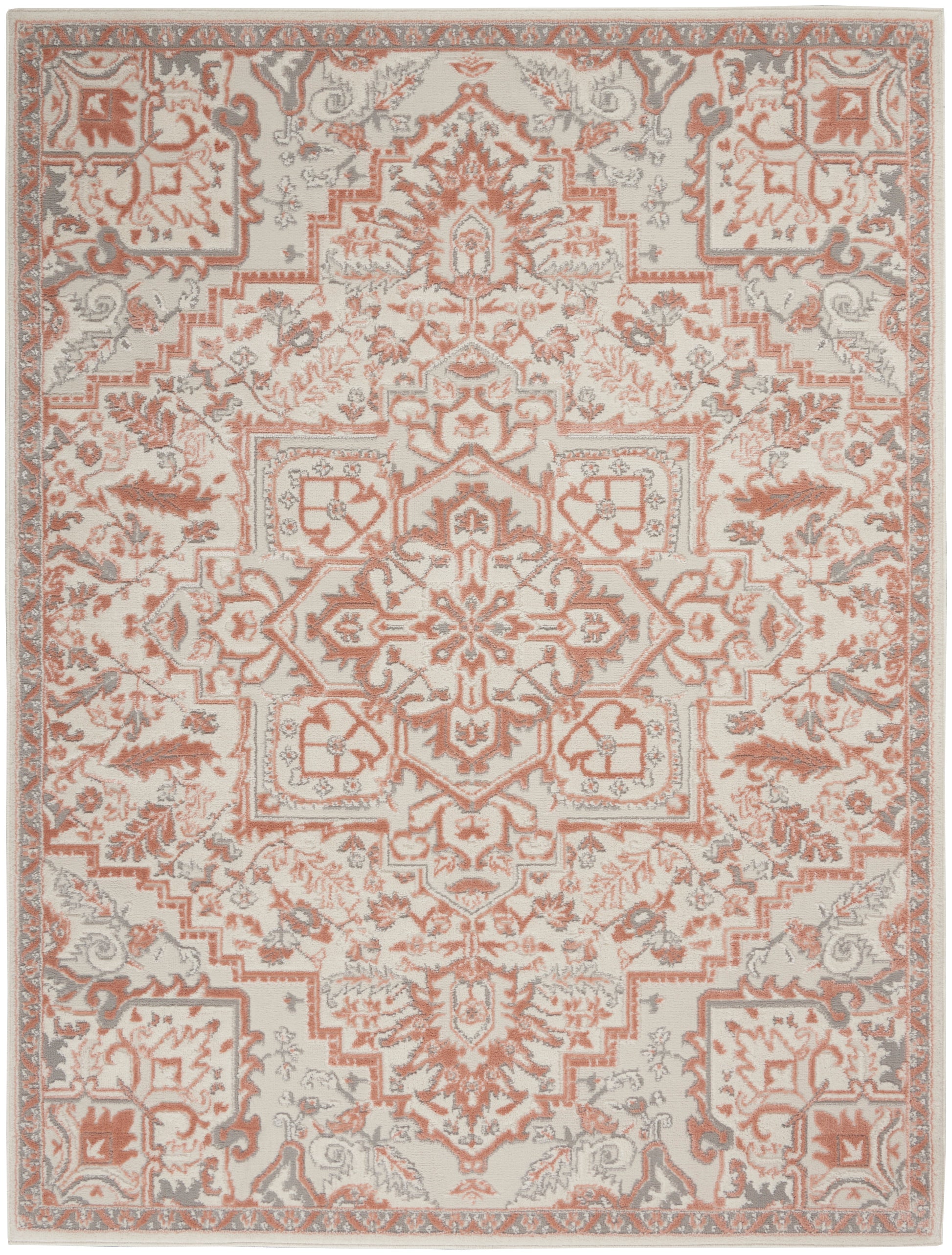 A stunning floral center medallion in soft ivory and brick red tones make this Elation area rug a sophisticated foundation for modern farmhouse, boho chic, and French country settings. Machine made of polyester and polypropylene, this vintage-inspired design is ideal for soft texture, easy cleaning, and lasting comfort. Ideal for use in your living room, bedroom, dining room, or any area that needs an instant style boost.