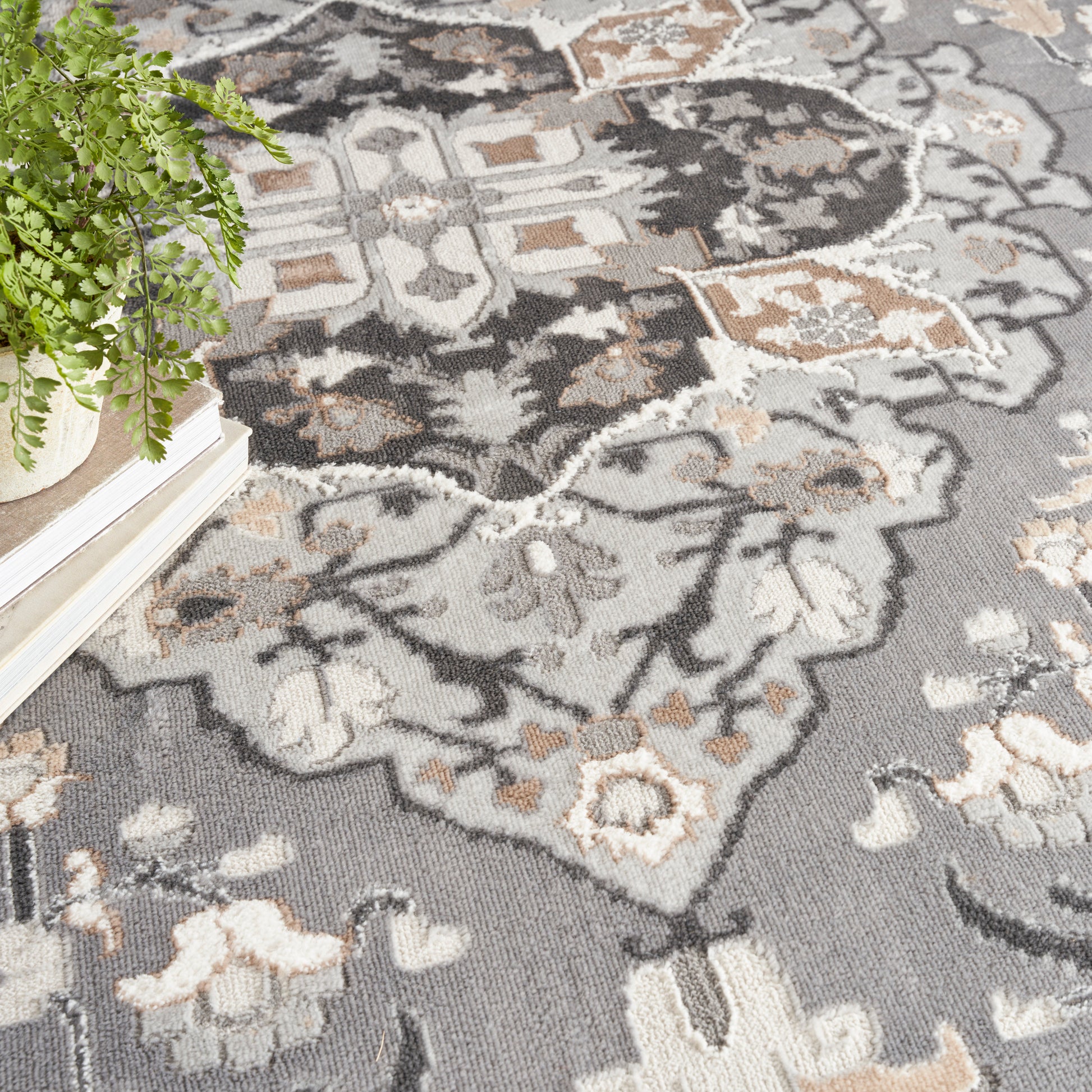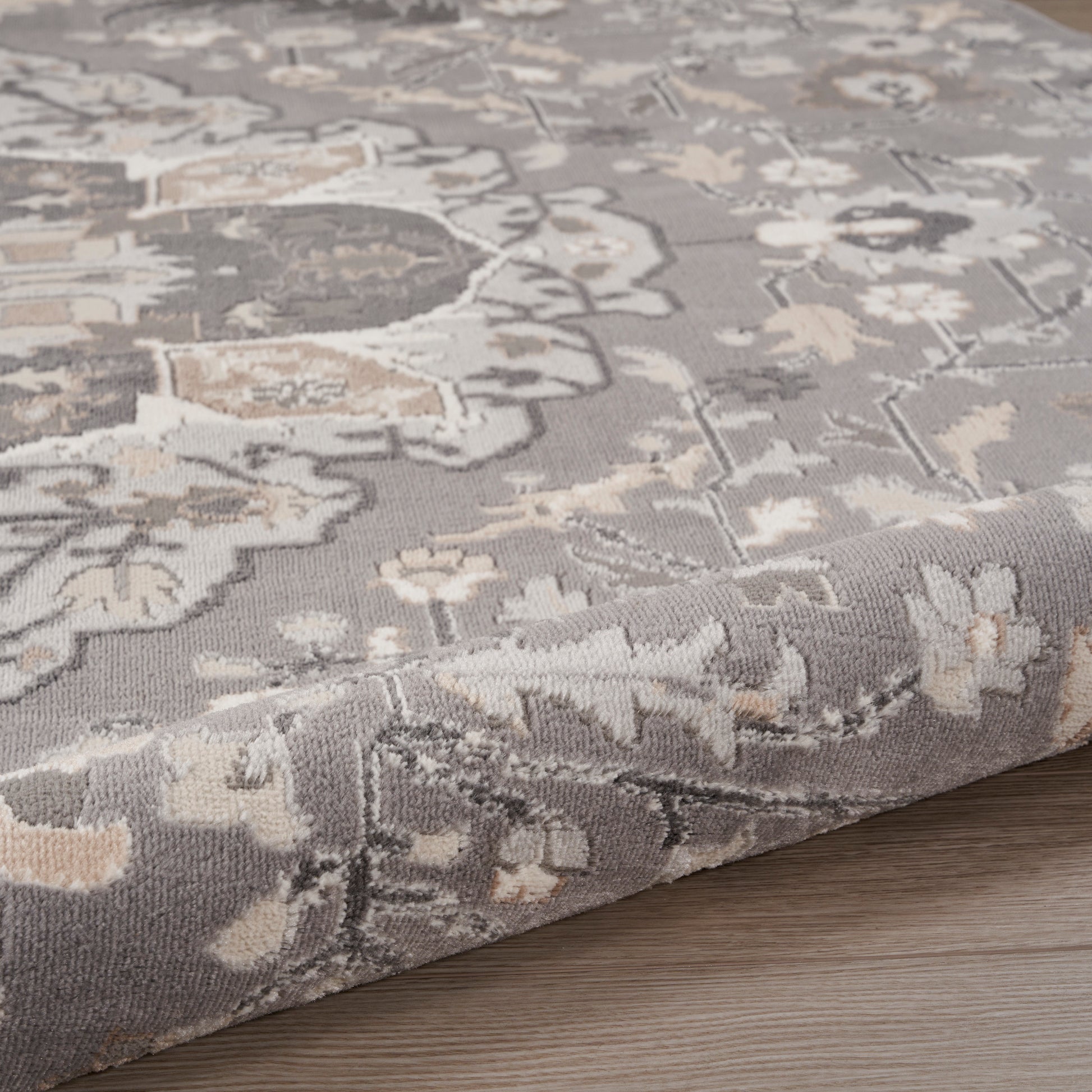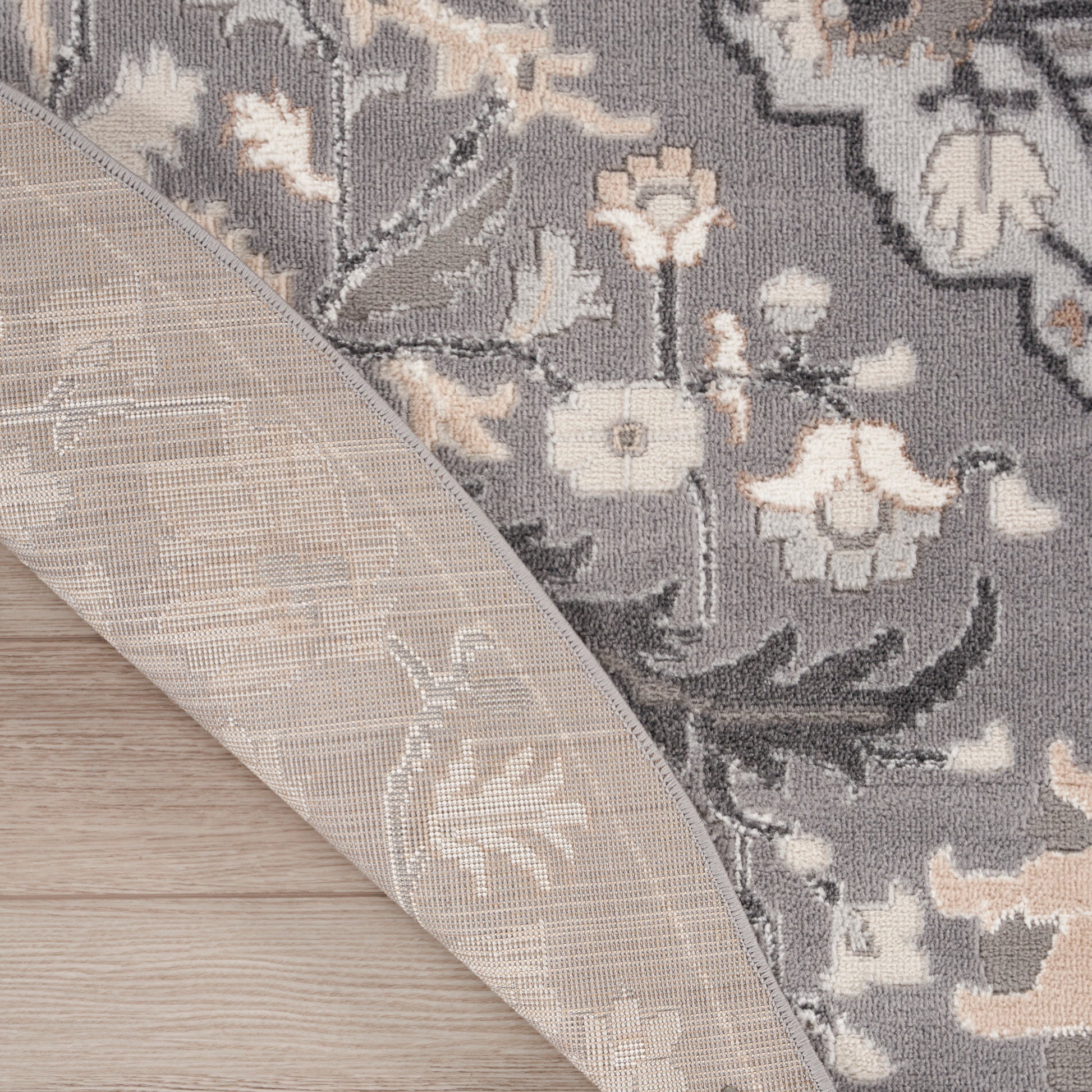 Create a welcoming environment in your living room, bedroom, dining room, or home office with this Elation Collection area rug. A Persian-inspired floral medallion in cool grey and ivory hues add a soft and elegant vibe to boho chic, farmhouse, and contemporary decor. This vintage-inspired design is machine made of polypropylene and polyester for soft texture, easy cleaning, and lasting comfort.