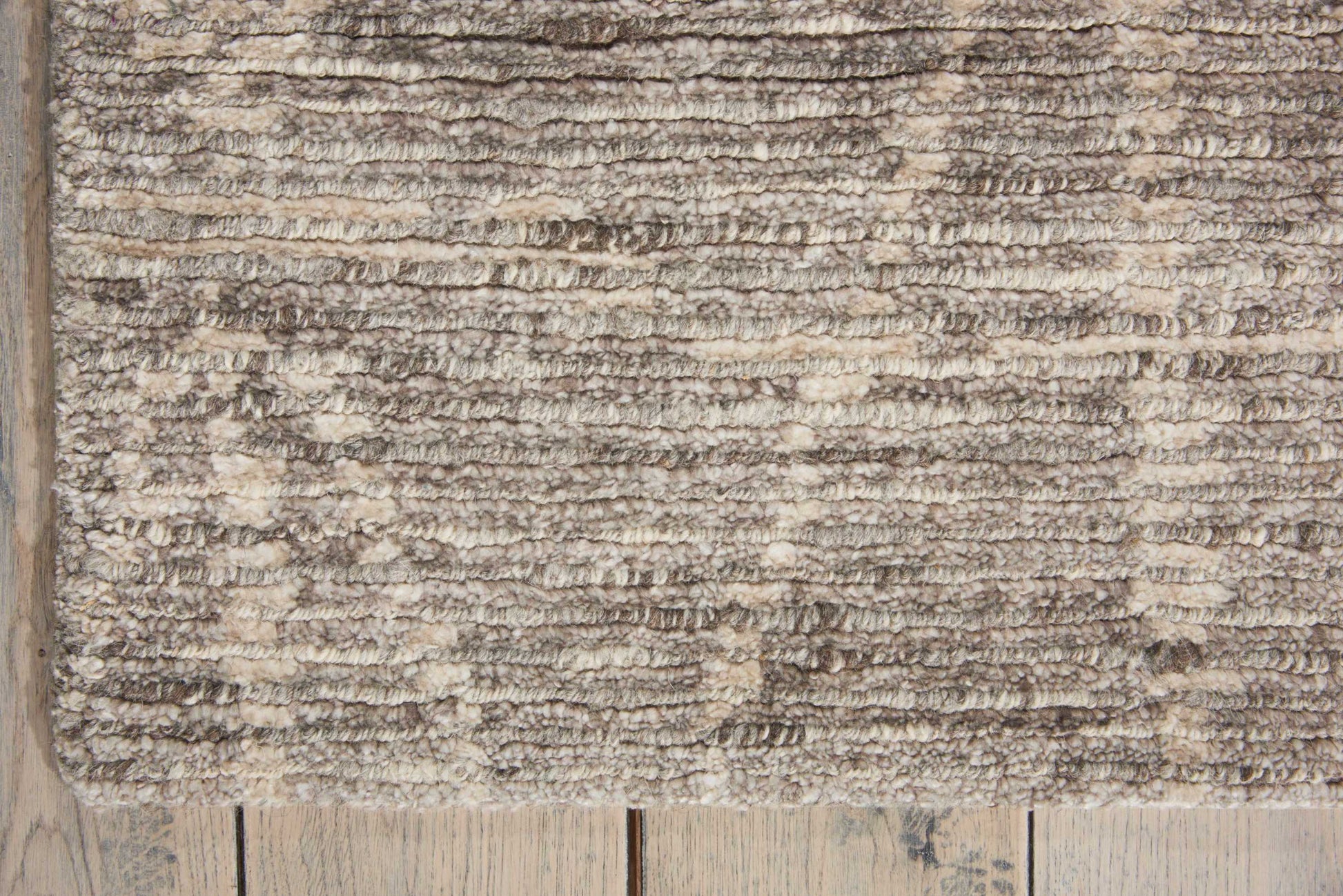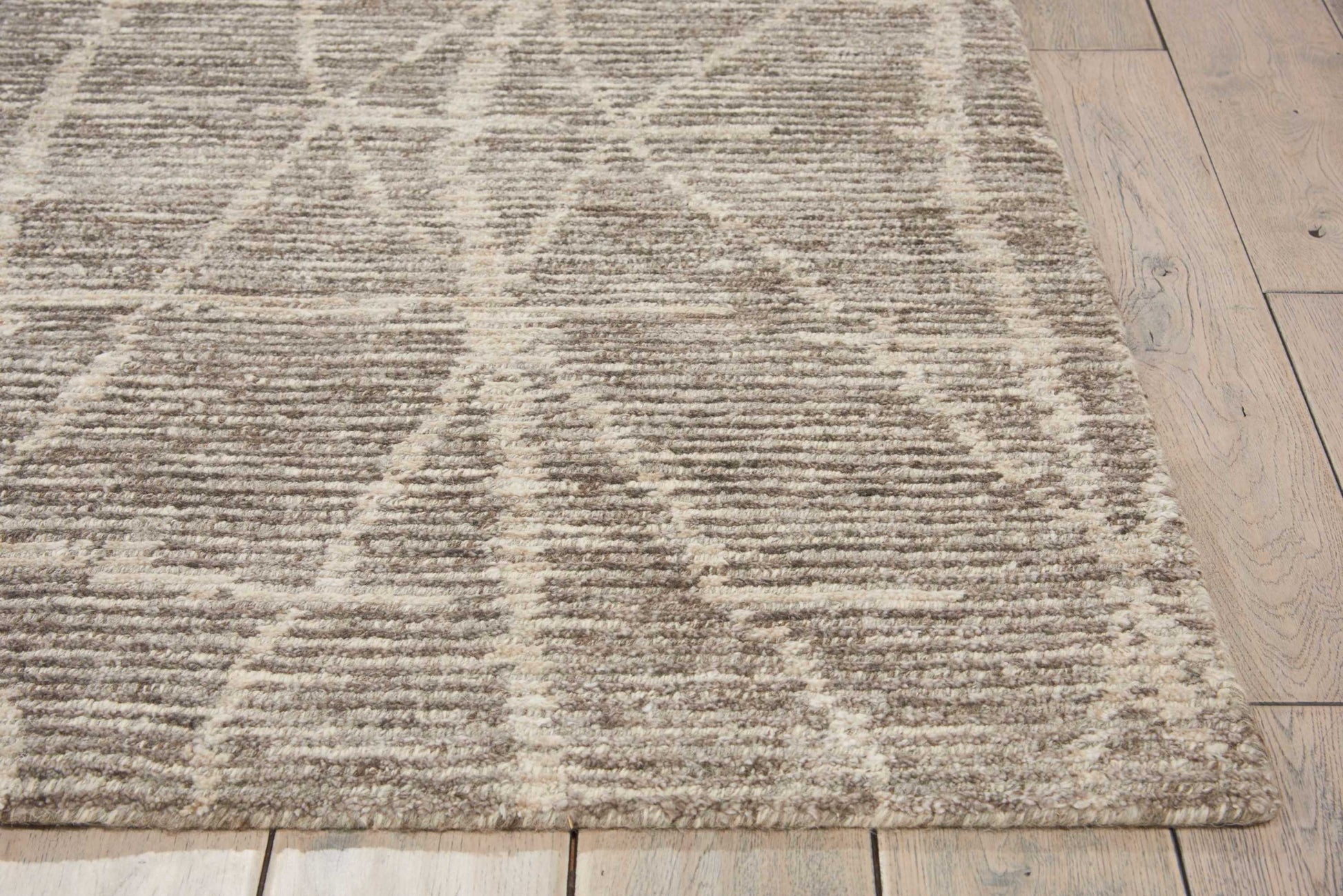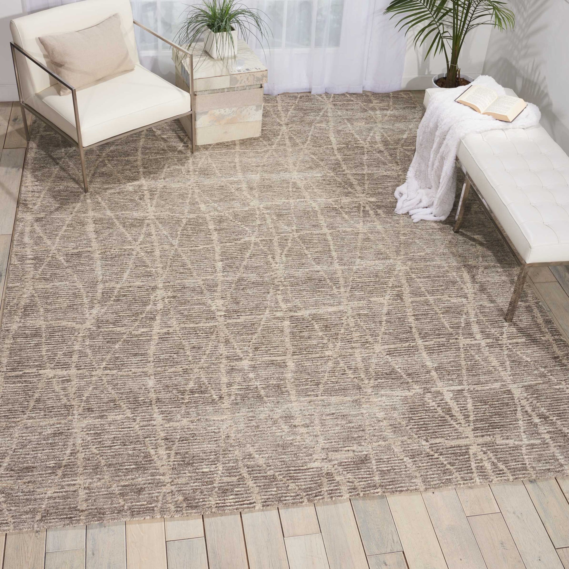 Like sand rich in quartzite crystals, this oversized Ellora area rug fairly gleams with elusive beauty. An abstract pattern of intersecting lines creates an etched effect of elongated diamonds, with texture enhanced by magnificent hand-knotting. Superb quality is evident in this versatile area rug designed for the sophisticated room.